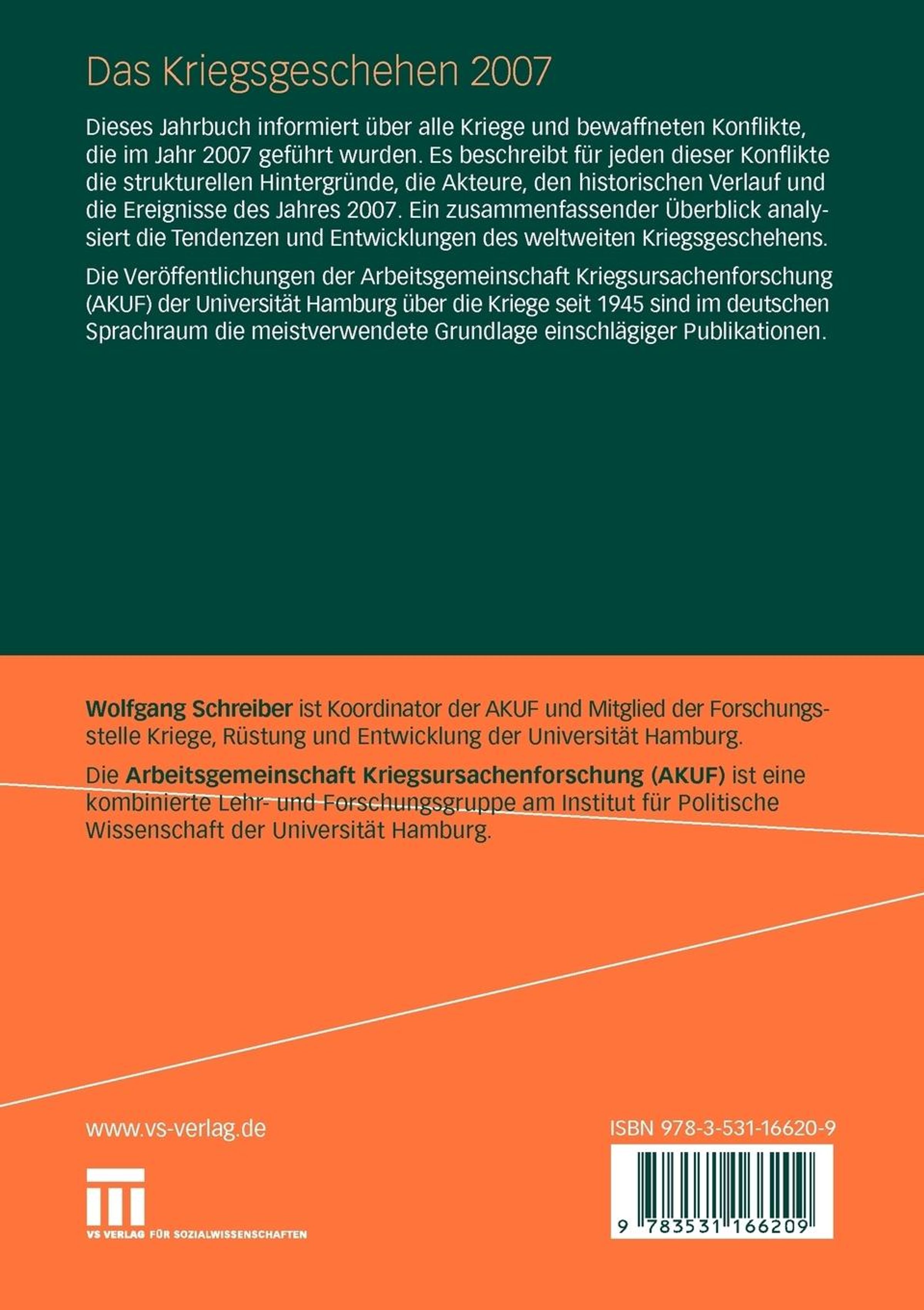 Das vorliegende Jahrbuch setzt die Reihe der seit 1993 erscheinenden Jahr- berichte der Arbeitsgemeinschaft Kriegsursachenforschung (AKUF) zum weltweiten Kriegsgeschehen fort. Das Jahrbuch 2007 steht dabei für ein kl- nes Jubiläum. Zum zehnten Mal erscheint ¿Das Kriegsgeschehen¿ damit in Buchform. Kernstück des Jahrbuchs ist das rund 230-seitige Konfliktregister mit seinen Einzelberichten zu 42 Konflikten. Sie geben Auskunft über die str- turellen Hintergründe, die historischen Entwicklungen und die aktuellen Ereignisse der Kriege und bewaffneten Konflikte des Jahres 2007. Ein Index der Konfliktakteure sowie Hinweise auf weiterführende Literatur und aktu- le Internet-Adressen machen das Konfliktregister zu einem benutzerfreu- lichen Nachschlagewerk, das sowohl eine schnelle, aktuelle Information wie auch eine vertiefte Lektüre zu den aktuellen Gewaltkonflikten ermöglicht. Eingebettet sind die Einzelberichte in einen Überblick über die Tendenzen und Charakteristika des Kriegsgeschehens im Berichtsjahr 2007, der diese in regionale und internationale Zusammenhänge einordnet. Die Arbeit an diesem Jahrbuch ist eine Gemeinschaftsleistung der AKUF, die 1978 von Prof. Dr. Klaus Jürgen Gantzel gegründet wurde und seither als Forschungsseminar am Institut für Politische Wissenschaft der Universität Hamburg angeboten wird. ¿Das Kriegsgeschehen¿ ist das Hau- periodikum der AKUF, zugleich aber nur ein Ausschnitt der umfangreichen wissenschaftlichen Tätigkeit ihrer Mitglieder. Hierzu zählt neben verschie- nen Forschungsprojekten und zahllosen Veröffentlichungen auch eine - fangreiche Kriege-Datenbank. Einen umfassenden Überblick über die Arbeit der AKUF und über das weltweite Kriegsgeschehen bietet die AKUF- Homepage unter < www. akuf. de >.
