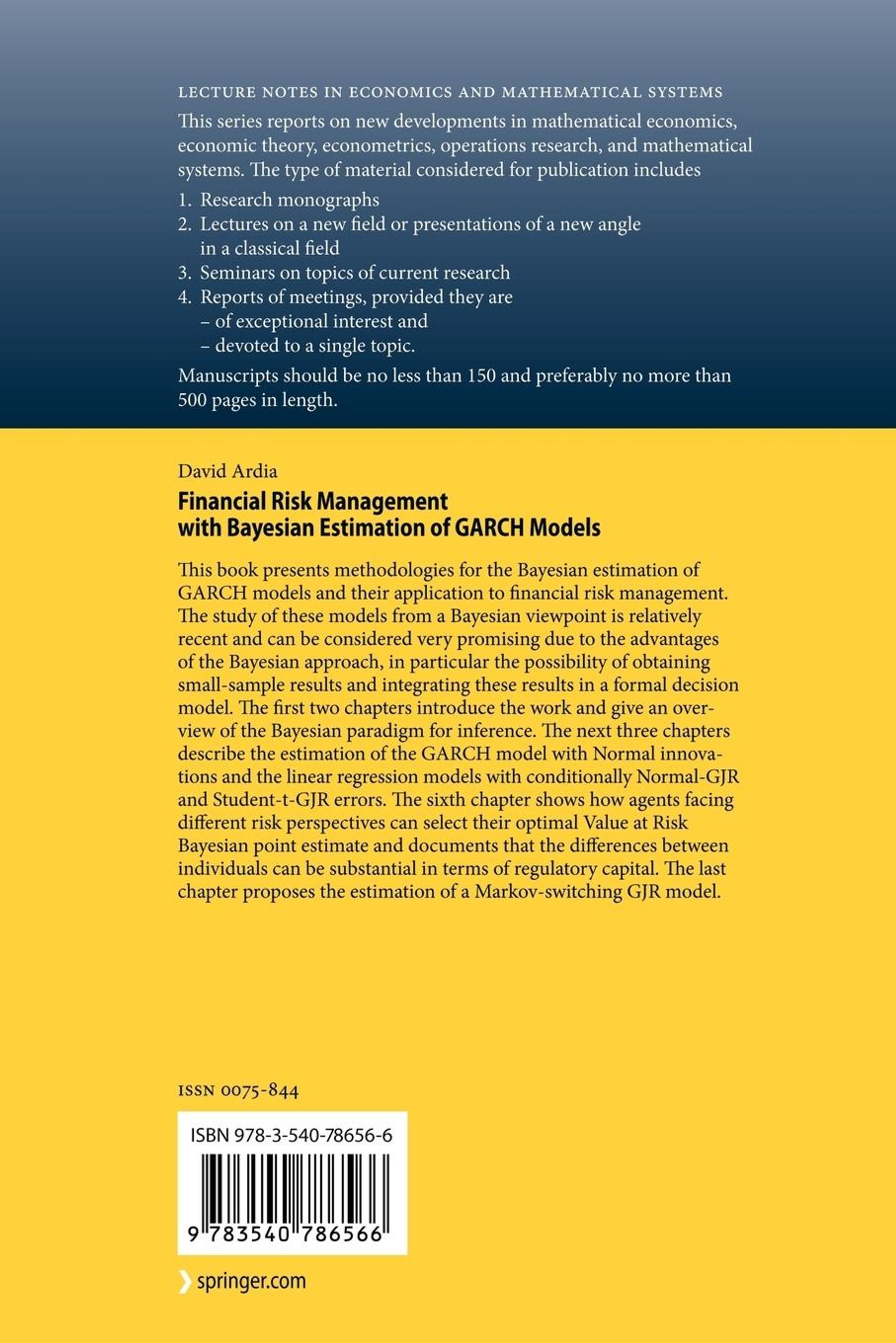 This book presents in detail methodologies for the Bayesian estimation of sing- regime and regime-switching GARCH models. These models are widespread and essential tools in n ancial econometrics and have, until recently, mainly been estimated using the classical Maximum Likelihood technique. As this study aims to demonstrate, the Bayesian approach o ers an attractive alternative which enables small sample results, robust estimation, model discrimination and probabilistic statements on nonlinear functions of the model parameters. The author is indebted to numerous individuals for help in the preparation of this study. Primarily, I owe a great debt to Prof. Dr. Philippe J. Deschamps who inspired me to study Bayesian econometrics, suggested the subject, guided me under his supervision and encouraged my research. I would also like to thank Prof. Dr. Martin Wallmeier and my colleagues of the Department of Quantitative Economics, in particular Michael Beer, Roberto Cerratti and Gilles Kaltenrieder, for their useful comments and discussions. I am very indebted to my friends Carlos Ord as Criado, Julien A. Straubhaar, J er ^ ome Ph. A. Taillard and Mathieu Vuilleumier, for their support in the elds of economics, mathematics and statistics. Thanks also to my friend Kevin Barnes who helped with my English in this work. Finally, I am greatly indebted to my parents and grandparents for their support and encouragement while I was struggling with the writing of this thesis.
