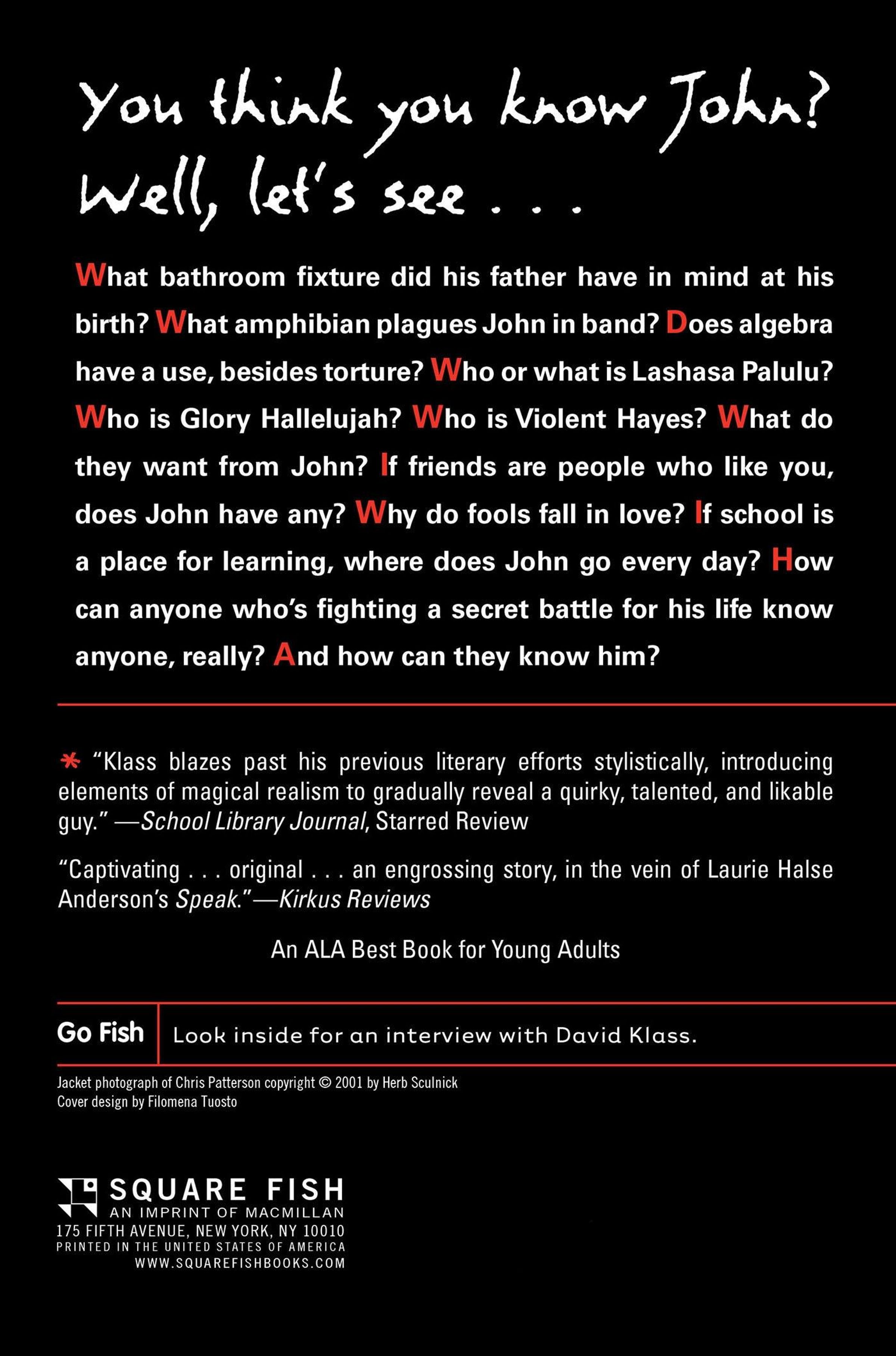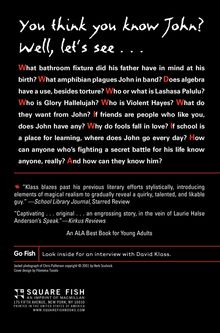 John ("My father named me after a toilet!") wrestles with the certainty that no one really knows him -- not in his miserable home, and certainly not at school. It's true that no one can guess his hidden thoughts, which are hilarious, razor-sharp observations about lust, love, tubas, algebra, everything. And then there's his home: his father ran off years ago, so he's being raised by his mother, who works long hours, and by her boyfriend, whom John calls "the man who is not and never will be my father." This man is his enemy, an abusive disciplinarian who seems to want to kill John and, in a horrible final confrontation, nearly succeeds.