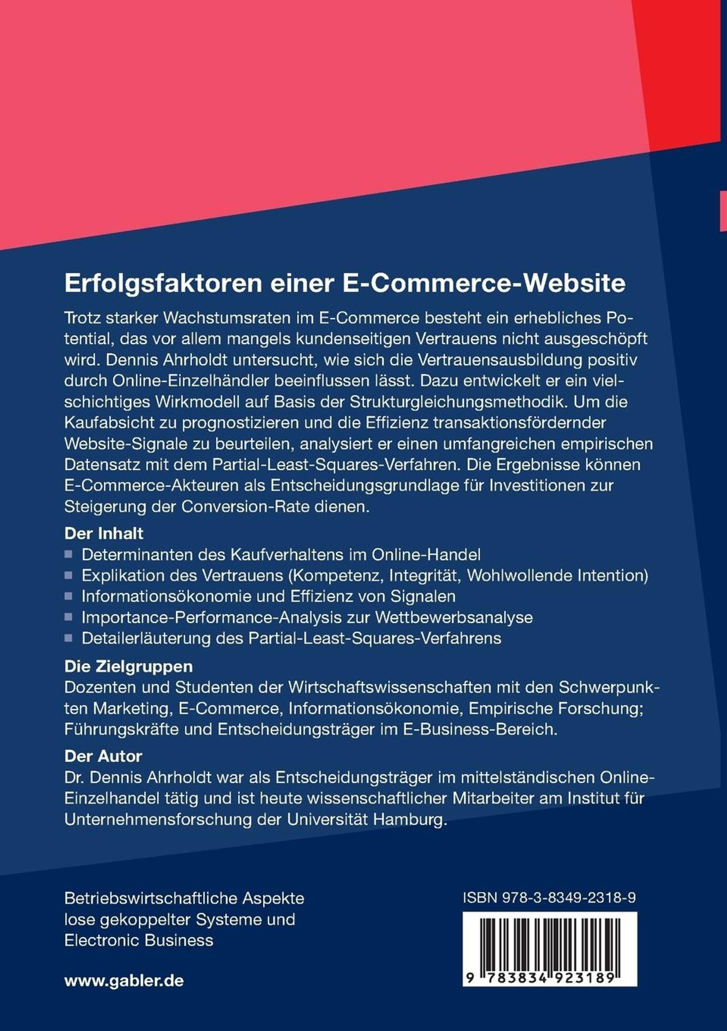 Dennis Ahrholdt untersucht mit dem Partial-Least-Squares-Verfahren, wie sich die Vertrauensausbildung als zentrale Antezedenz der Kaufabsicht positiv im E-Commerce beeinflussen lässt. Die Ergebnisse können als Entscheidungsgrundlage für Investitionen zur Steigerung der Conversion-Rate dienen.