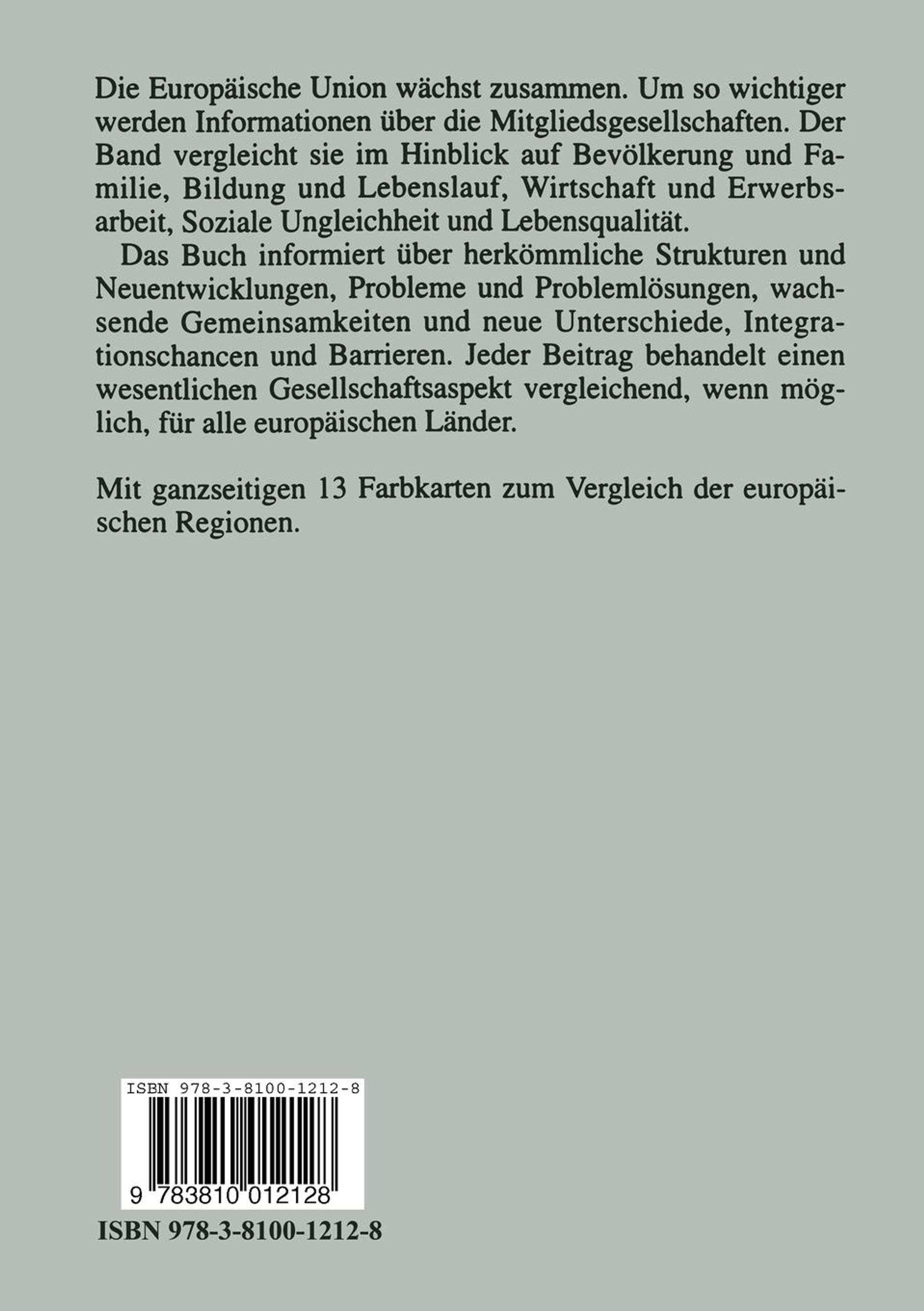 Die Europäische Union wächst zusammen. Um so wichtiger werdenInformationen über die Mitgliedsgesellschaften. Der Band vergleicht sie imHinblick auf Bevölkerung und Familie, Bildung und Lebenslauf, Wirtschaft undErwerbsarbeit, Soziale Ungleichheit und Lebensqualität. Das Buch informiert über herkömmliche Strukturen undNeuentwicklungen, Probleme und Problemlösungen, wachsende Gemeinsamkeiten undneue Unterschiede, Integrationschancen und Barrieren. Jeder Beitrag behandelteinen wesentlichen Gesellschaftsaspekt vergleichend, wenn möglich, für alleeuropäischen Länder. Beiträge von JuttaAllmendinger, Rudolph Andorka, Bernhard Ebbinghaus, Ma Haller, RichardHauser, Martin Heidenreich, Thomas Hinz, Charlotte Höhn, François Höpflinger, Stefan Hradil, Stefan Immerfall, Hartmut Kaelble, Walter Müller, Heinz-Herbert Noll, Reinhard Schneider, Susanne Steinmann, Göran Therborn, Jelle Visser. Aus dem Inhalt: Kapitel 1: Einleitung: Auf dem Wege zur europäischenGesellschaft? Kapitel 2: Bevölkerung und Familie Kapitel 3: Bildung und Lebenslauf Kapitel 4: Wirtschaft und Erwerbsarbeit Kapitel 5: Ungleichheit und Lebensqualität Kapitel 6: Westeuropa und seine Nachbarn Kapitel 7: Kartenteil Pressestimmen: ...eignet sich der Band hervorragend für einen Einstieg ineine europäisch vergleichend orientierte Sozialstrukturanalyse. Aber auch denLeser, der nicht unmittelbar an wissenschaftlichen Ergebnissen per seinteressiert ist, sondern mehr an gut lesbaren Zusammenfassungen, kann dasBuch über weite Teile hin zufriedenstellen. Insofern haben die Herausgeberund die Autoren eine gute Arbeit vorgelegt, die sicher ihren Weg in dieLiteraturlisten der Seminare finden wird. Soziologische Revue