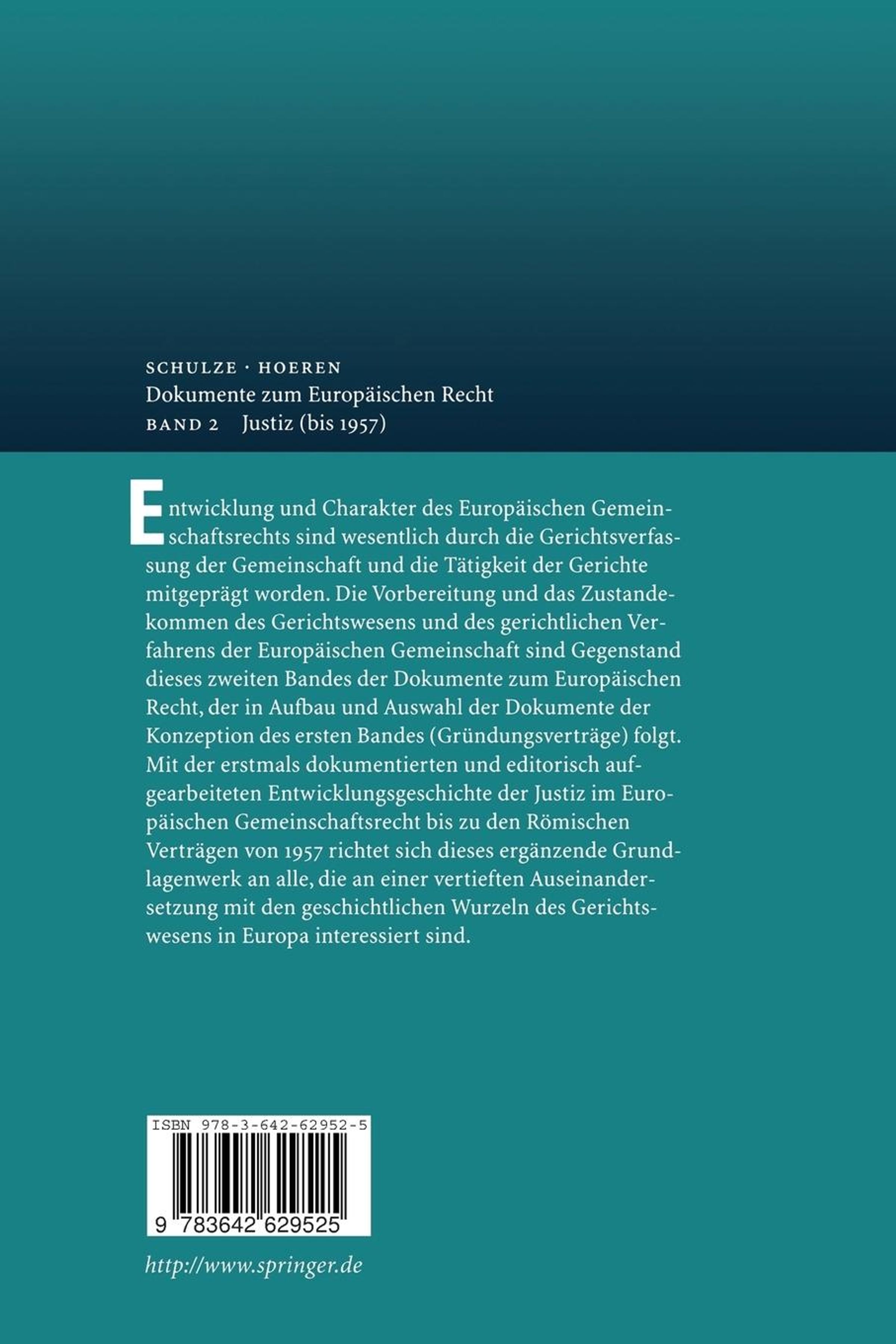 Entwicklung und Charakter des Europäischen Gemeinschaftsrechts sind wesentlich durch die Gerichtsverfassung der Gemeinschaft und die Tätigkeit der Gerichte mitgeprägt worden. Die Vorbereitung und das Zustandekommen des Gerichtswesens und des gerichtlichen Verfahrens der Europäischen Gemeinschaft sind Gegenstand dieses zweiten Bandes der Dokumente zum Europäischen Recht, der in Aufbau und Auswahl der Dokumente der Konzeption des ersten Bandes ("Gründungsverträge") folgt. Mit der erstmals dokumentierten und editorisch aufgearbeiteten Entwicklungsgeschichte der Justiz im Europäischen Gemeinschaftsrecht bis zu den Römischen Verträgen von 1957 richtet sich dieses ergänzende Grundlagenwerk an alle, die an einer vertieften Auseinandersetzung mit den geschichtlichen Wurzeln des Gerichtswesens in Europa interessiert sind.