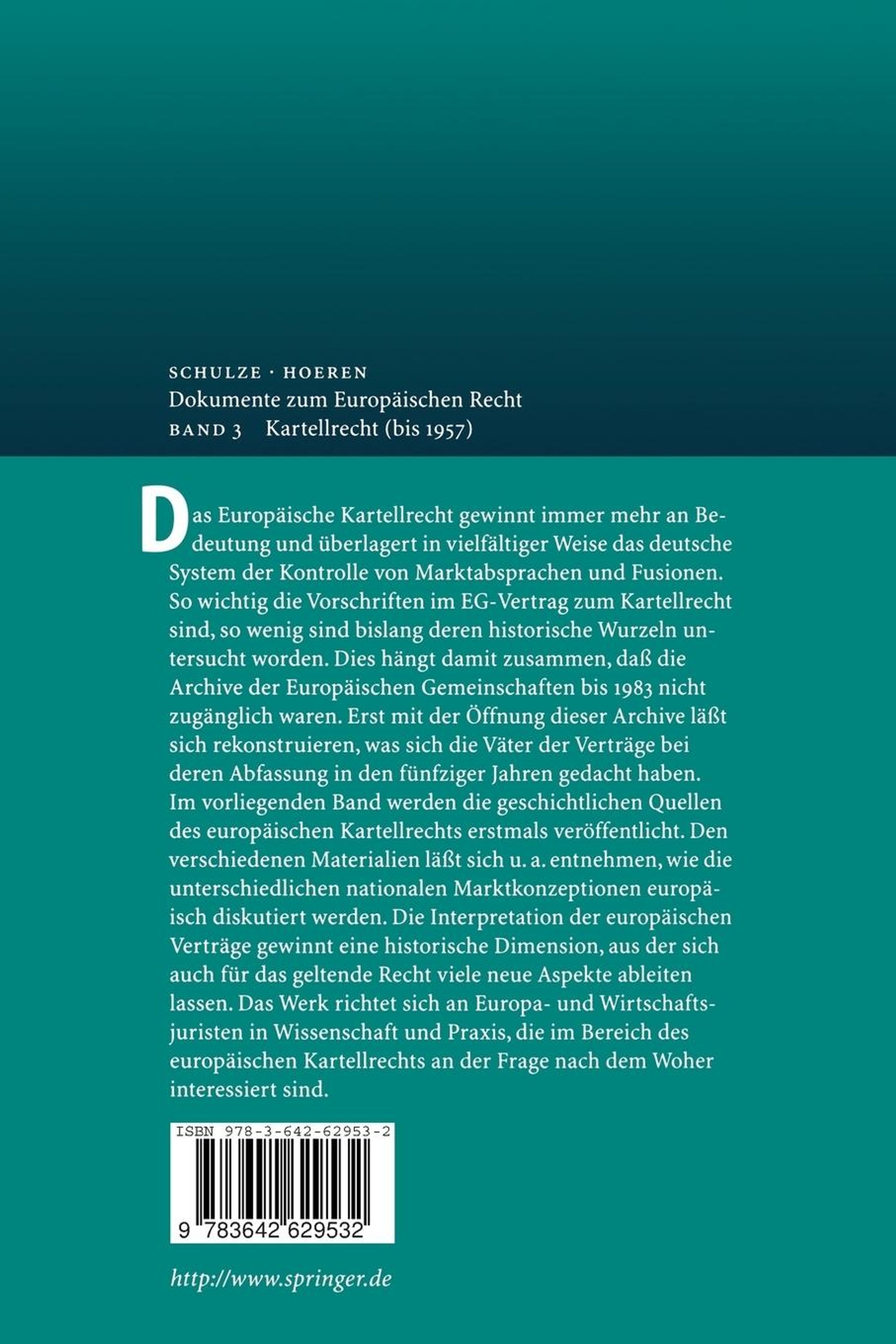 Das Europäische Kartellrecht gewinnt immer mehr an Bedeutung und überlagert in vielfältiger Weise das deutsche System der Kontrolle von Marktabsprachen und Fusionen. So wichtig die Vorschriften im EG-Vertrag zum Kartellrecht sind, so wenig sind bislang deren historische Wurzeln untersucht worden. Dies hängt damit zusammen, daß die Archive der Europäischen Gemeinschaften bis 1983 nicht zugänglich waren. Erst mit der Öffnung der Archive läßt sich rekonstruieren, was sich die Väter der Verträge bei deren Abfassung in den fünfziger Jahren gedacht haben. Im vorliegenden Band werden die geschichtlichen Quellen des europäischen Kartellrechts erstmals veröffentlicht. Den verschiedenen Materialien läßt sich u. a. entnehmen, wie die unterschiedlichen nationalen Marktkonzeptionen europäisch diskutiert werden. Die Interpretation der europäischen Verträge gewinnt eine historische Dimension, aus der sich auch für das geltende Recht viele neue Aspekte ableiten lassen. Das Werk richtet sich an Europa- und Wirtschaftsjuristen in Wissenschaft und Praxis, die im Bereich des Europäischen Kartellrechts and der Frage nach dem Woher interessiert sind.