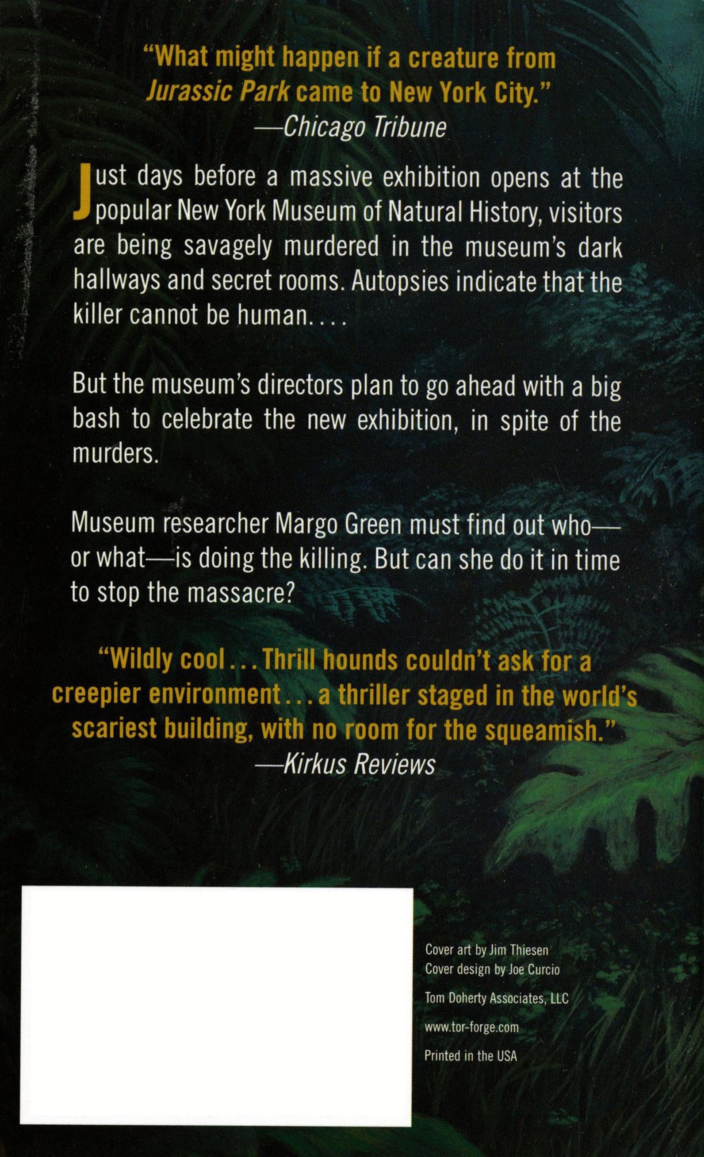 Just days before a massive exhibition opens at the popular New York Museum of Natural History, visitors are being savagely murdered in the museum's dark hallways and secret rooms. Autopsies indicate that the killer cannot be human...