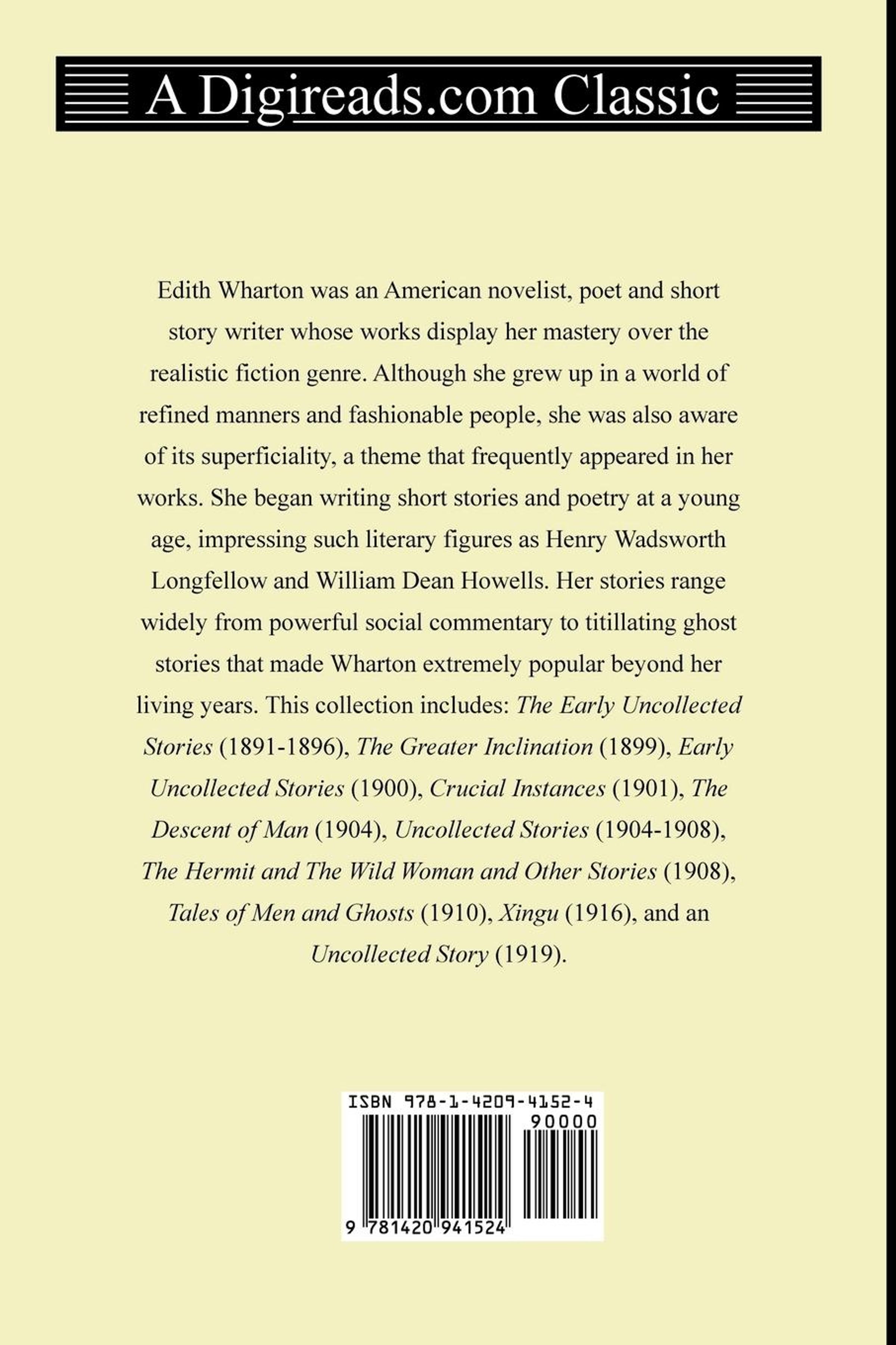 Edith Wharton was an American novelist, poet and short story writer whose works display her mastery over the realistic fiction genre. Although she grew up in a world of refined manners and fashionable people, she was also aware of its superficiality, a theme that frequently appeared in her works. She began writing short stories and poetry at a young age, impressing such literary figures as Henry Wadsworth Longfellow and William Dean Howells. Her stories range widely from powerful social commentary to titillating ghost stories that made Wharton extremely popular beyond her living years. This collection includes: The Early Uncollected Stories (1891-1896), The Greater Inclination (1899), Early Uncollected Stories (1900), Crucial Instances (1901), The Descent of Man (1904), Uncollected Stories (1904-1908), The Hermit and The Wild Woman and Other Stories (1908), Tales of Men and Ghosts (1910), Xingu (1916), and an Uncollected Story (1919).