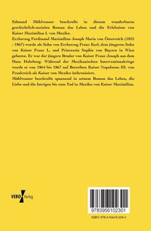 Edmund Mühlwasser beschreibt in diesem wunderbaren geschichtlich-sozialen Roman das Leben und die Erlebnisse von Kaiser Maximilian I. von Mexiko. Erzherzog Ferdinand Maximilian Joseph Maria von Österreich (1832 - 1867) wurde als Sohn von Erzherzog Franz Karl, dem jüngeren Sohn von Kaiser Franz I., und Prinzessin Sophie von Bayern in Wien geboren. Er war der jüngere Bruder von Kaiser Franz Joseph aus dem Haus Habsburg. Während der Mexikanischen Interventionskriege wurde er von 1864 bis 1867 auf Betreiben Kaiser Napoleons III. von Frankreich als Kaiser von Mexiko inthronisiert. Mühlwasser beschreibt spannend in seinem Roman das Leben, die Liebe und die Intrigen bis zum Tod in Mexiko von Kaiser Maximilian.