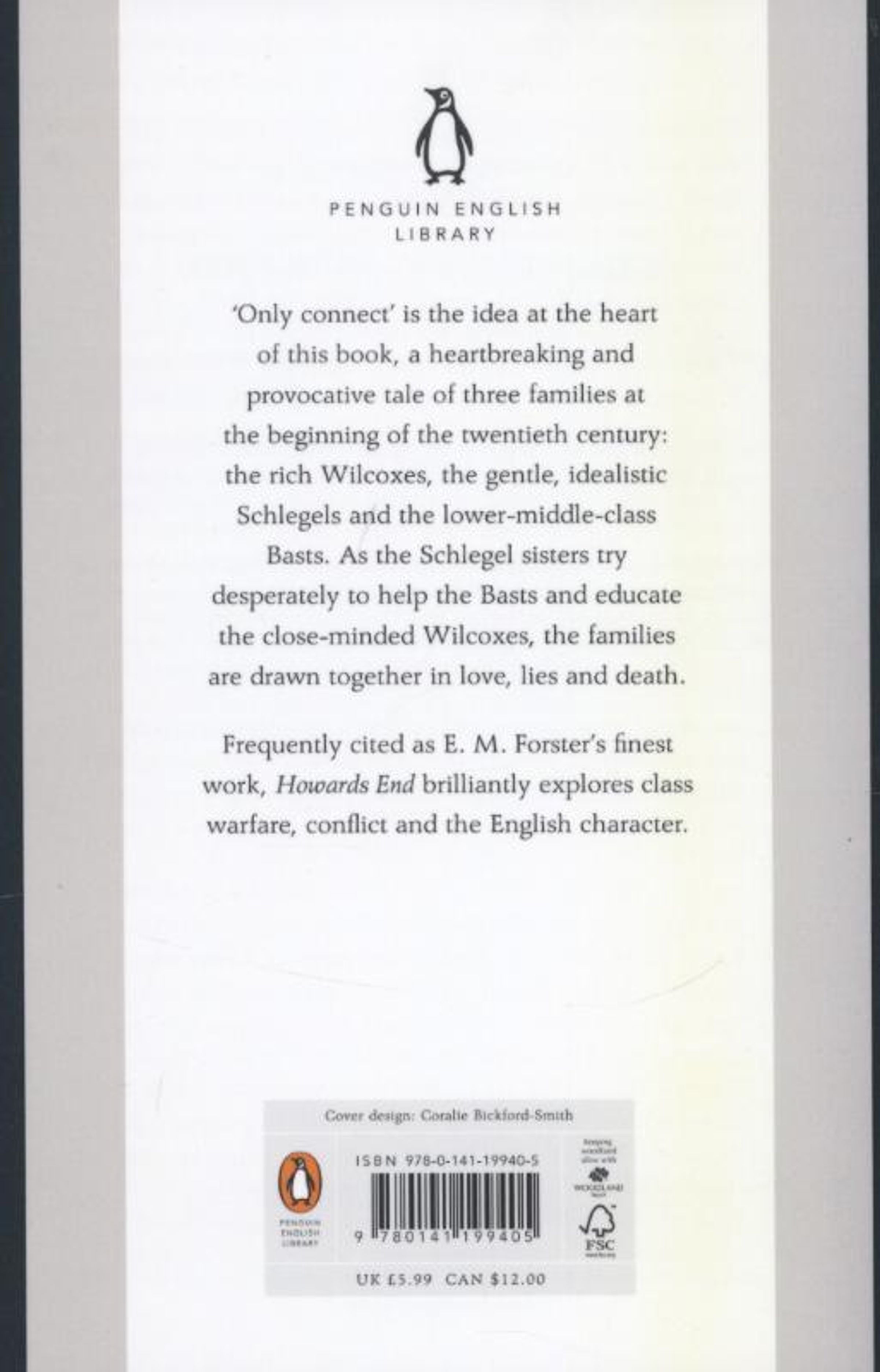 The Penguin English Library Edition of Howards End by E. M. Forster 'The poor cannot always reach those whom they want to love, and they can hardly ever escape from those whom they love no longer. We rich can' 'Only connect.' is the idea at the heart of this book, a heartbreaking and provocative tale of three families at the beginning of the twentieth century: the rich Wilcoxes, the gentle, idealistic Schlegels and the lower-middle class Basts. As the Schlegel sisters try desperately to help the Basts and educate the close-minded Wilcoxes, the families are drawn together in love, lies and death. Frequently cited as E. M. Forster's finest work, Howards End brilliantly explores class warfare, conflict and the English character. The Penguin English Library - 100 editions of the best fiction in English, from the eighteenth century and the very first novels to the beginning of the First World War.