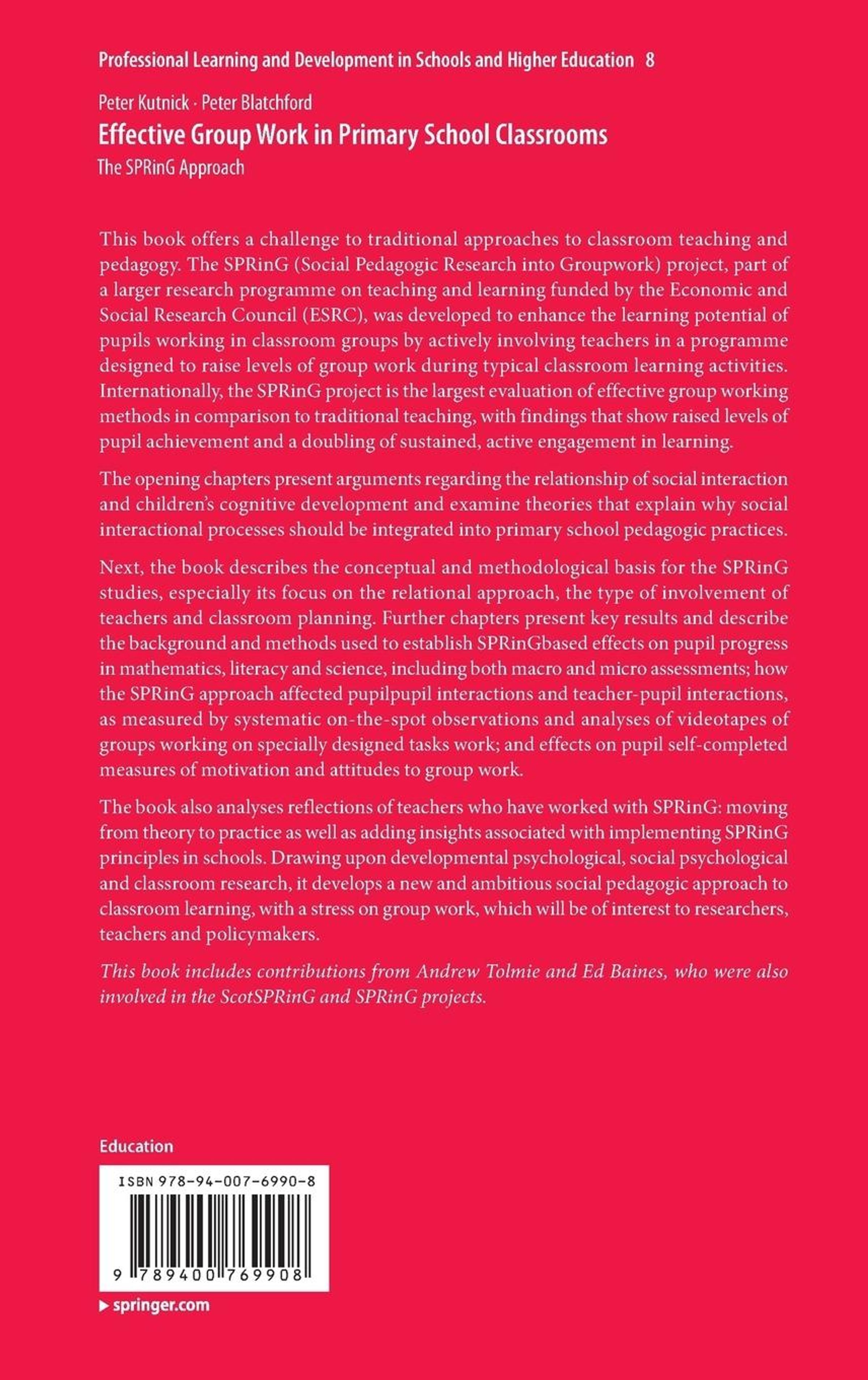This book offers a challenge to traditional approaches to classroom teaching and pedagogy. The SPRinG (Social Pedagogic Research into Groupwork) project, part of a larger research programme on teaching and learning funded by the Economic and Social Research Council (ESRC), was developed to enhance the learning potential of pupils working in classroom groups by actively involving teachers in a programme designed to raise levels of group work during typical classroom learning activities. Internationally, the SPRinG project is the largest evaluation of effective group working methods in comparison to traditional teaching, with findings that show raised levels of pupil achievement and a doubling of sustained, active engagement in learning. The opening chapters present arguments regarding the relationship of social interaction and children¿s cognitive development and examine theories that explain why social interactional processes should be integrated into primary school pedagogic practices. Next, the book describes the conceptual and methodological basis for the SPRinG studies, especially its focus on the relational approach, the type of involvement of teachers and classroom planning. Further chapters present key results and describe the background and methods used to establish SPRinG-based effects on pupil progress in mathematics, literacy and science, including both macro and micro assessments; how the SPRinG approach affected pupil-pupil interactions and teacher-pupil interactions, as measured by systematic on-the-spot observations and analyses of videotapes of groups working on specially designed tasks work; and effects on pupil self-completed measures of motivation and attitudes to group work. The book also analyses reflections of teachers who have worked with SPRinG: moving from theory to practice as well as adding insights associated with implementing SPRinG principles in schools. Drawing upon developmental psychological, socialpsychological and classroom research, it develops a new and ambitious social pedagogic approach to classroom learning, with a stress on group work, which will be of interest to researchers, teachers and policy-makers. This book includes contributions from Andrew Tolmie and Ed Baines, who were also involved in the ScotSPRinG and SPRinG projects.