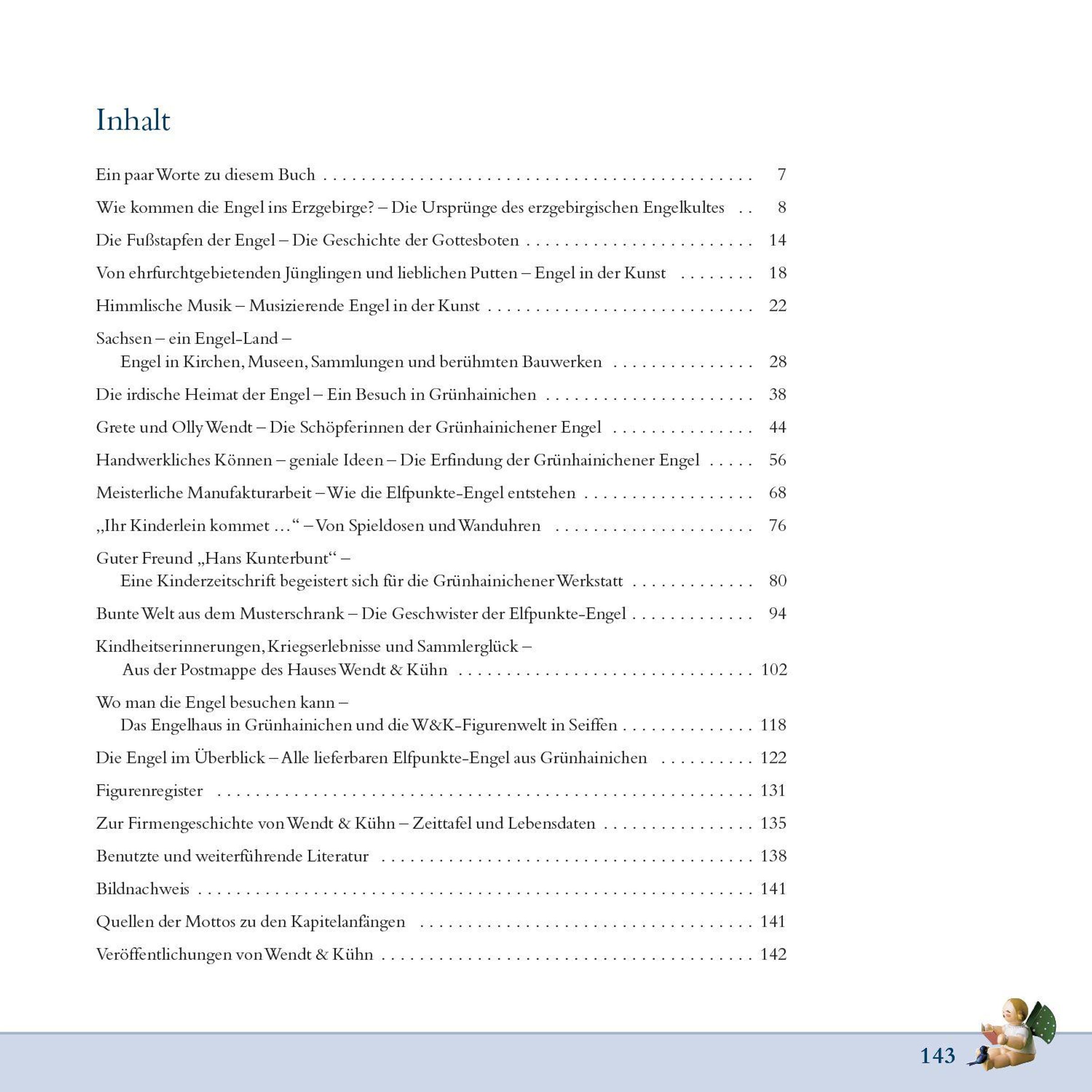 Ein paar Worte zu diesem Buch · Wie kommen die Engel ins Erzgebirge? - Die Ursprünge des erzgebirgischen Engelkultes · Die Fußstapfen der Engel - Die Geschichte der Gottesboten · Von ehrfurchtgebietenden Jünglingen und lieblichen Putten - Engel in der Kunst · Himmlische Musik - Musizierende Engel in der Kunst · Sachsen - ein Engel-Land - Engel in Kirchen, Museen, Sammlungen und berühmten Bauwerken · Die irdische Heimat der Engel - Ein Besuch in Grünhainichen · Grete und Olly Wendt - Die Schöpferinnen der Grünhainichener Engel · Handwerkliches Können - geniale Ideen - Die Erfindung der Grünhainichener Engel · Meisterliche Manufakturarbeit - Wie die Elfpunkte-Engel entstehen · "Ihr Kinderlein kommet ..." - Von Spieldosen und Wanduhren · Guter Freund "Hans Kunterbunt" - Eine Kinderzeitschrift begeistert sich für die Grünhainichener Werkstatt · Bunte Welt aus dem Musterschrank - Die Geschwister der Elfpunkte-Engel · Kindheitserinnerungen, Kriegserlebnisse und Sammlerglück - Aus der Postmappe des Hauses Wendt & Kühn · Wo man die Engel besuchen kann - Das Engelhaus in Grünhainichen und die W&K-Figurenwelt in Seiffen · Die Engel im Überblick - Alle lieferbaren Elfpunkte-Engel aus Grünhainichen · Figurenregister · Zur Firmengeschichte von Wendt & Kühn - Zeittafel und Lebensdaten · Benutzte und weiterführende Literatur · Bildnachweis · Quellen der Motti zu den Kapitelanfängen · Veröffentlichungen von Wendt & Kühn