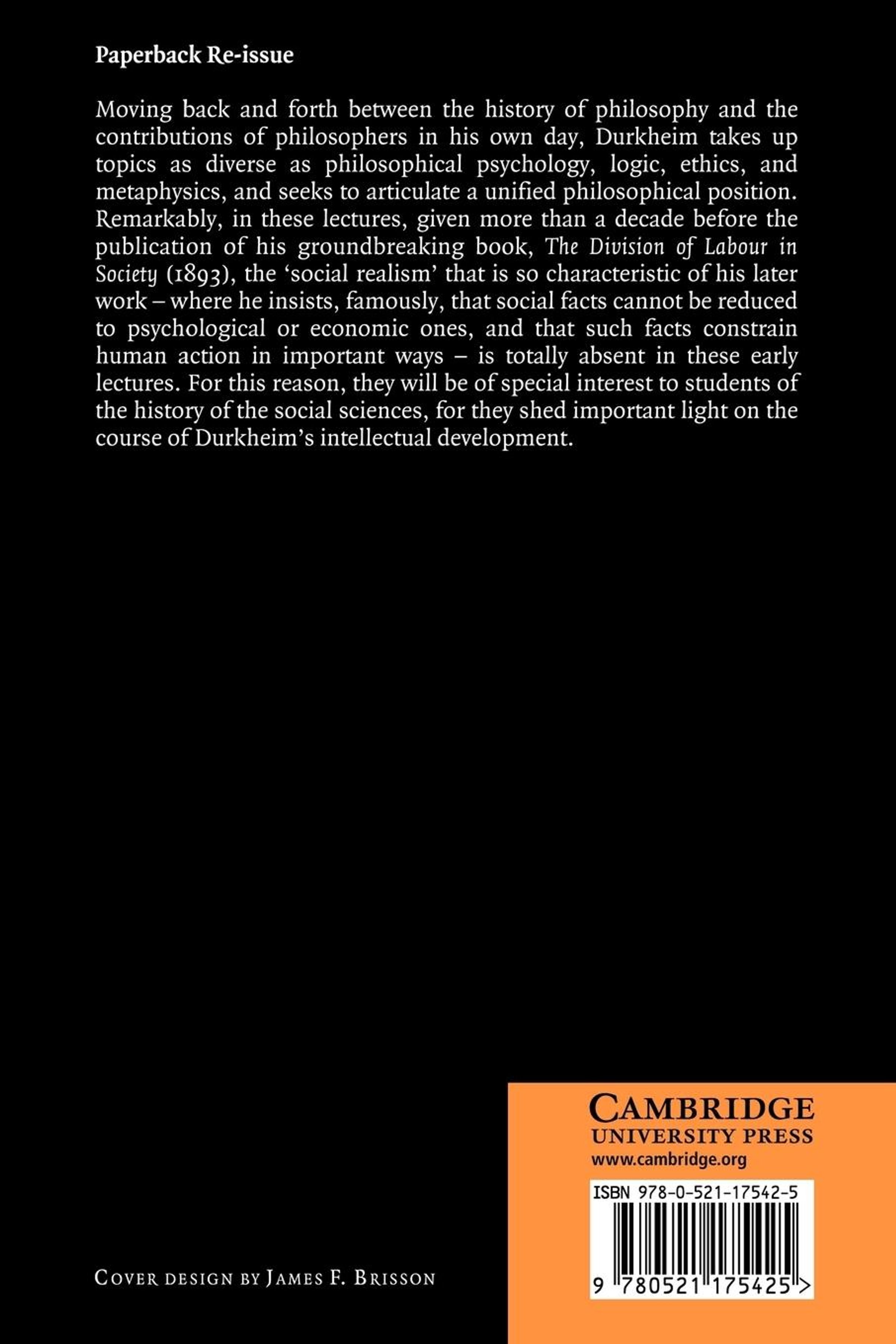 Moving back and forth between the history of philosophy and the contributions of philosophers in his own day, Durkheim takes up topics as diverse as philosophical psychology, logic, ethics, and metaphysics, and seeks to articulate a unified philosophical position. Remarkably, in these lectures, given more than a decade before the publication of his groundbreaking book, The Division of Labour in Society (1893), the 'social realism' that is so characteristic of his later work - where he insists, famously, that social facts cannot be reduced to psychological or economic ones, and that such facts constrain human action in important ways - is totally absent in these early lectures. For this reason, they will be of special interest to students of the history of the social sciences, for they shed important light on the course of Durkheim's intellectual development.