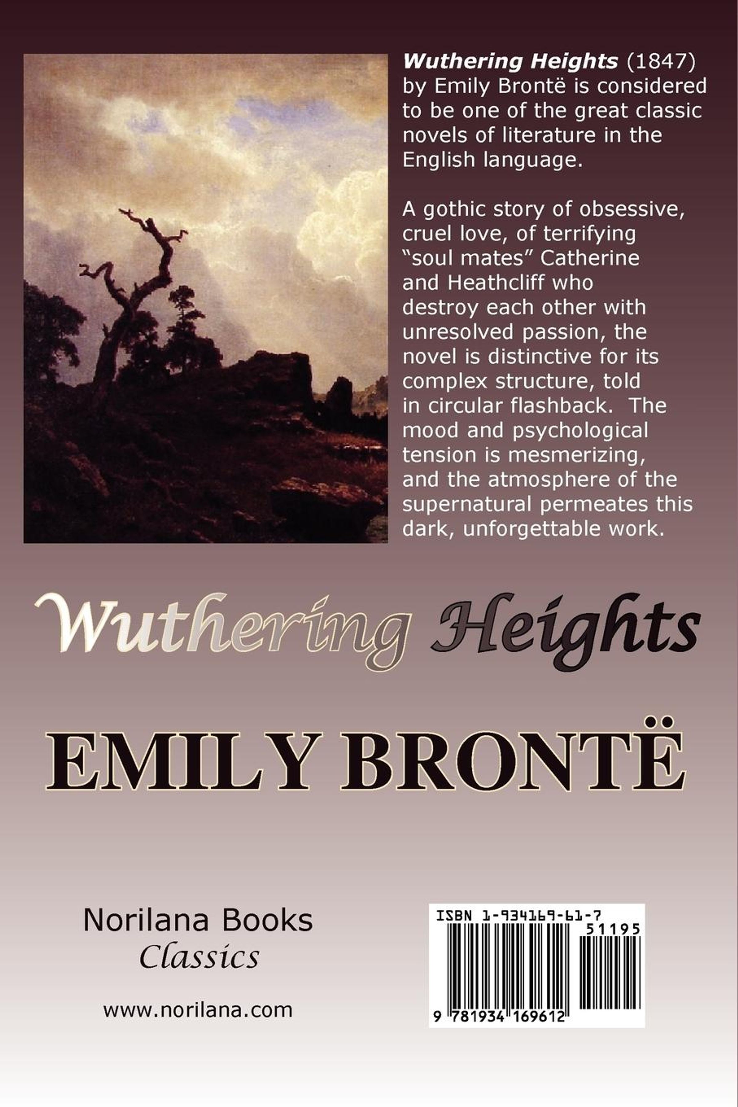 A gothic story of obsessive, cruel love, of terrifying "soul mates" Catherine and Heathcliff who destroy each other with unresolved passion, the novel is distinctive for its complex structure, told in circular flashback. The mood and psychological tension is mesmerizing, and the atmosphere of the supernatural permeates this dark, unforgettable work.