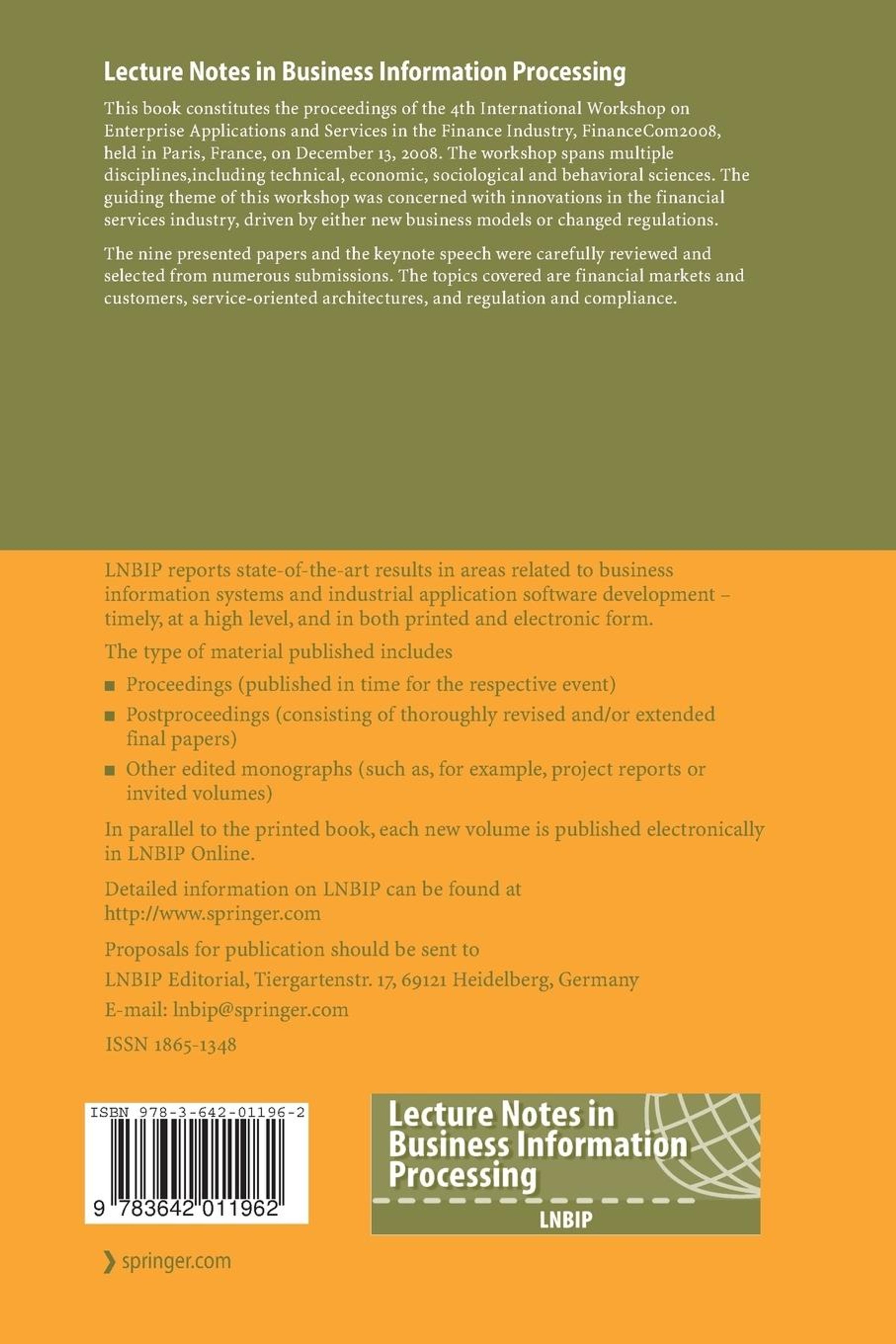 This book constitutes the proceedings of the 4th International Workshop on Enterprise Applications and Services in the Finance Industry, FinanceCom2008, held in Paris, France, on December 13, 2008. The workshop spans multiple disciplines, including technical, economic, sociological and behavioral sciences. The guiding theme of this workshop was concerned with innovations in the financial services industry, driven by either new business models or changed regulations. The nine presented papers and the keynote speech were carefully reviewed and selected from numerous submissions. The topics covered are financial markets and customers, service-oriented architectures, and regulation and compliance.