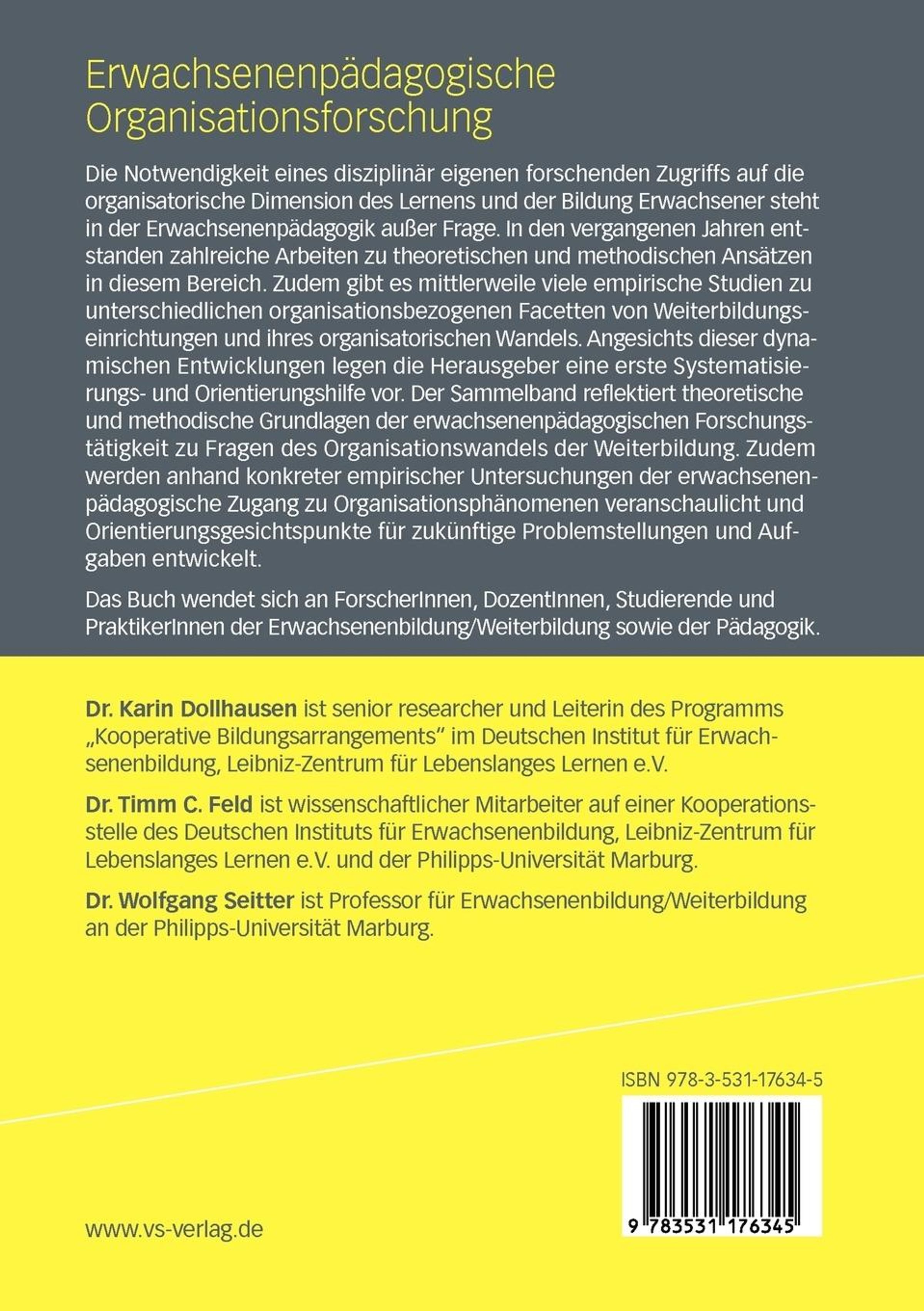 Timm C. Feld ist wissenschaftlicher Mitarbeiter am Institut für Erziehungswissenschaft der Universität Marburg und beim Deutschen Institut für Erwachsenenbildung in Bonn.Biografie (Wolfgang Seitter)