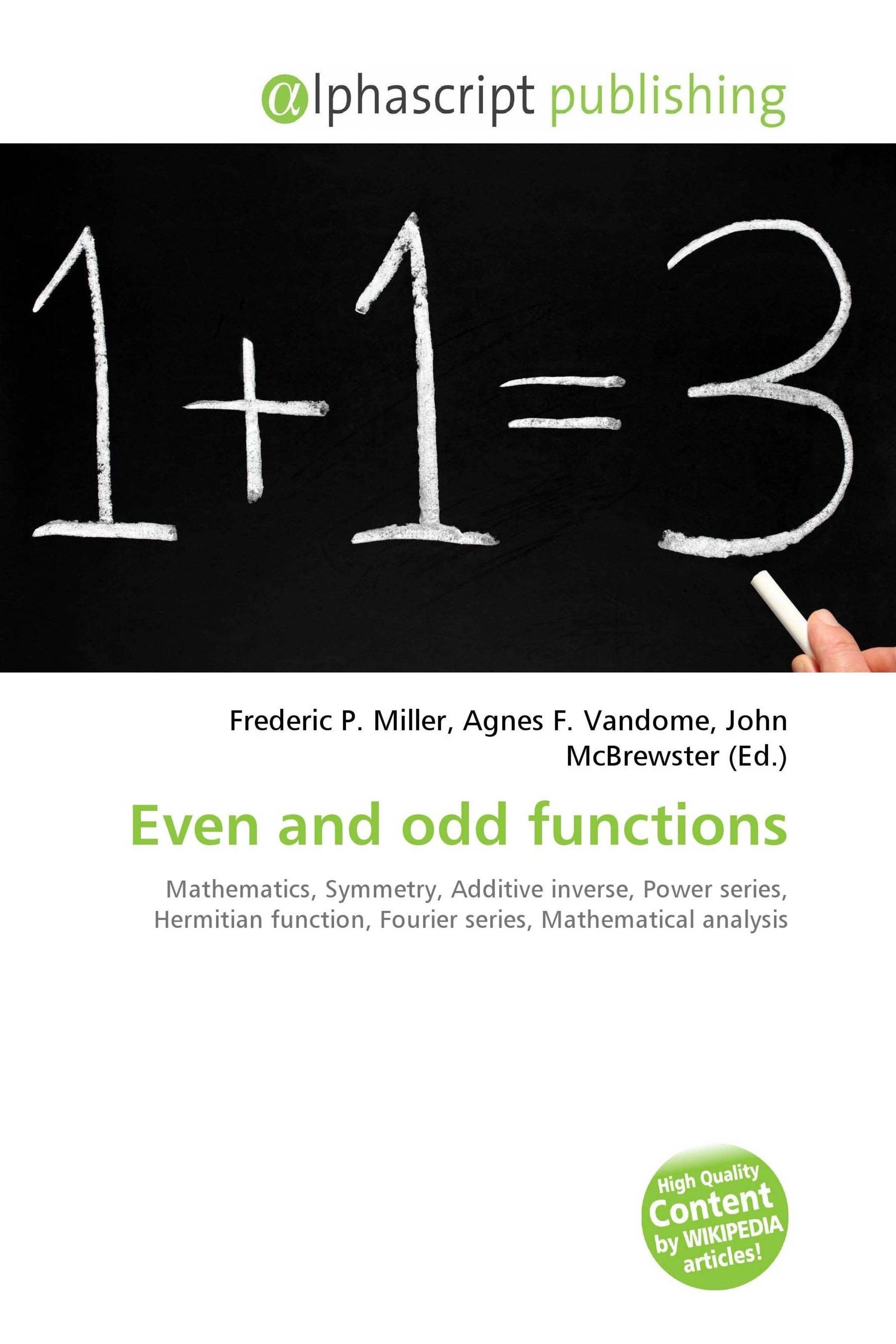 Please note that the content of this book primarily consists of articles available from Wikipedia or other free sources online. In mathematics, even functions and odd functions are functions which satisfy particular symmetry relations with respect to taking additive inverses. They are important in many areas of mathematical analysis, especially the theory of power series and Fourier series. They are named for the parity of the powers of the power functions which satisfy each condition: the function f (x ) = xn is an even function if n is an even integer and it is an odd function if n is an odd integer.