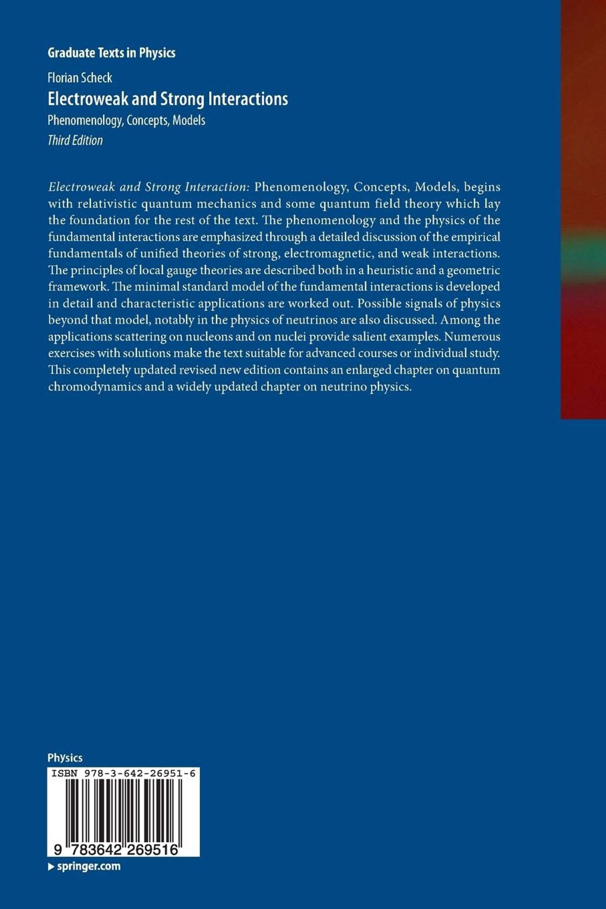 Electroweak and Strong Interaction: Phenomenology, Concepts, Models, begins with relativistic quantum mechanics and some quantum field theory which lay the foundation for the rest of the text. The phenomenology and the physics of the fundamental interactions are emphasized through a detailed discussion of the empirical fundamentals of unified theories of strong, electromagnetic, and weak interactions. The principles of local gauge theories are described both in a heuristic and a geometric framework. The minimal standard model of the fundamental interactions is developed in detail and characteristic applications are worked out. Possible signals of physics beyond that model, notably in the physics of neutrinos are also discussed. Among the applications scattering on nucleons and on nuclei provide salient examples. Numerous exercises with solutions make the text suitable for advanced courses or individual study. This completely updated revised new edition contains an enlarged chapter on quantum chromodynamics and a widely updated chapter on neutrino physics.