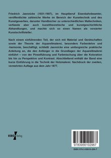Nach einem einführenden Teil, der sich mit Material und Gerätschaften sowie der Theorie der Aquarellmalerei, besonders Farbenlehre und -harmonie, beschäftigt, schließt Jaennicke eine umfangreiche praktische Anleitung an, die den Anfänger in die Grundlagen der Aquarellmalerei einführt von der Pinselführung und Farbmischung über die Koloration bis hin zu Perspektive und Kontrast. Abschließend enthält der Band eine kurze Einführung in die Technik der Holzmalerei. Nachdruck der zweiten, vermehrten Auflage aus dem Jahr 1877.