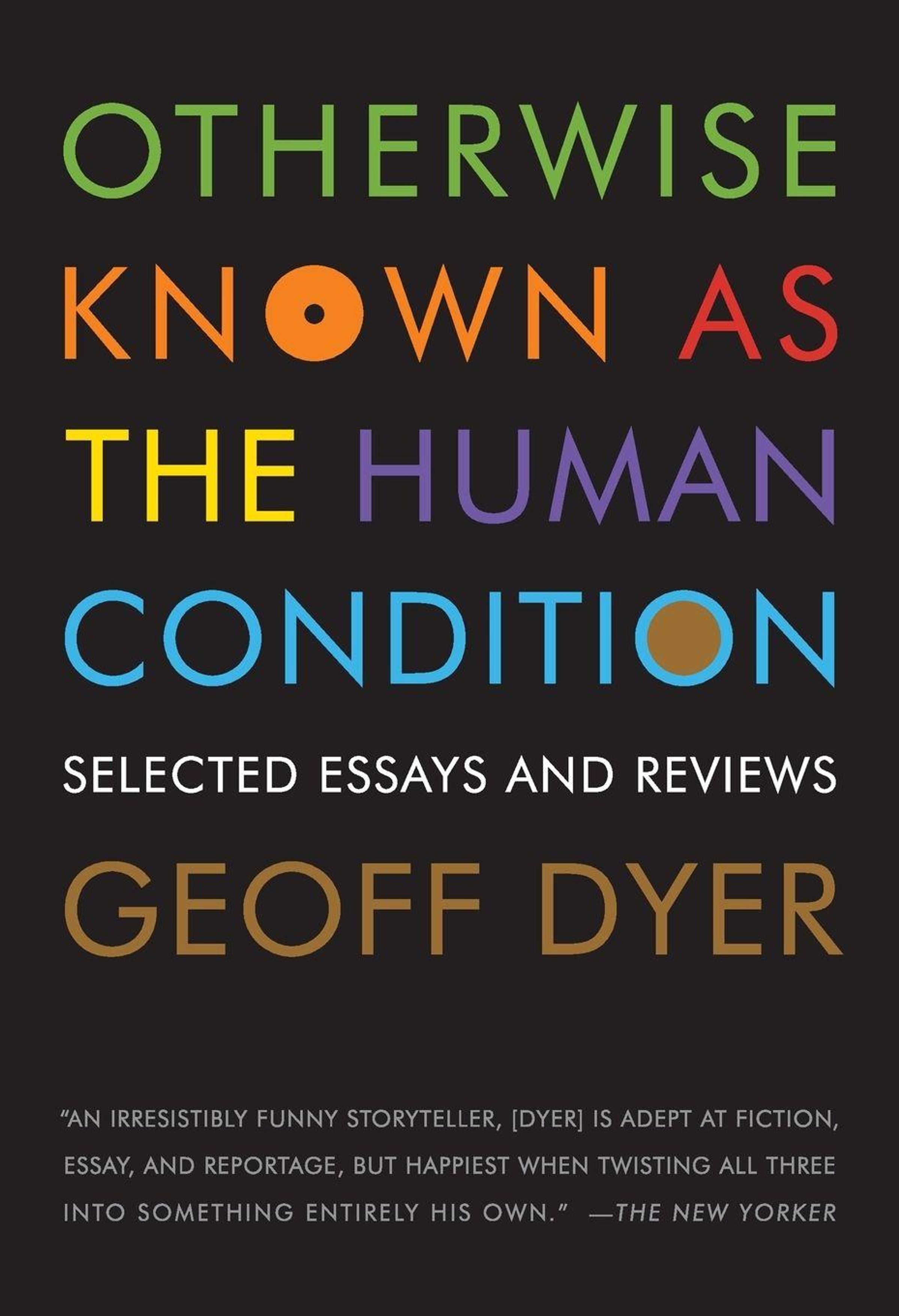 Buchtitel in bunten Buchstaben: "Otherwise Known as the Human Condition", Essays von Geoff Dyer auf schwarzem Hintergrund., Buch