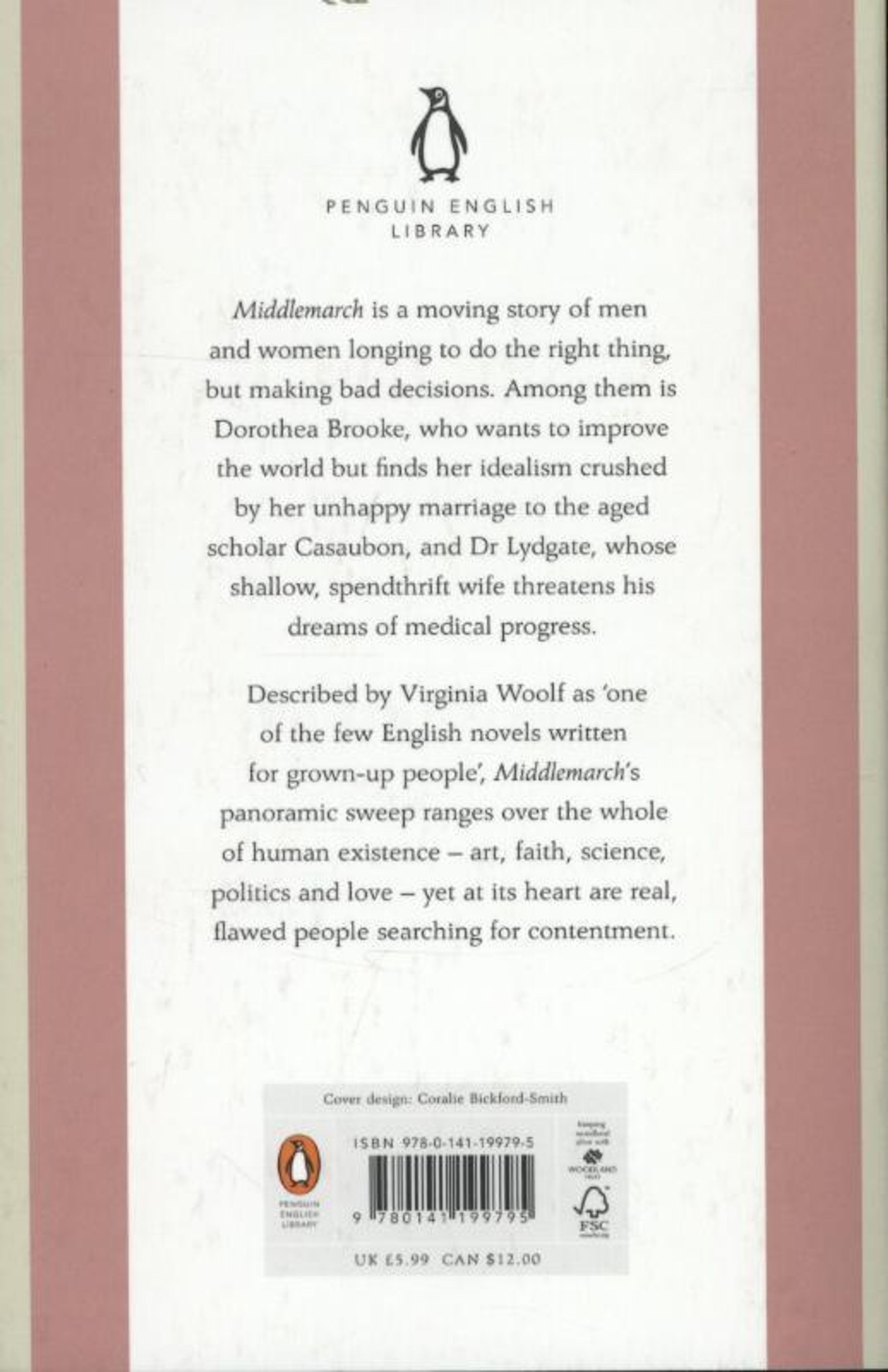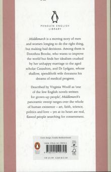 The Penguin English Library Edition of Middlemarch by George Eliot 'She did not know then that it was Love who had come to her briefly as in a dream before awaking, with the hues of morning on his wings - that it was Love to whom she was sobbing her farewell as his image was banished by the blameless rigour of irresistible day' George Eliot's most ambitious novel is a masterly evocation of diverse lives and changing fortunes in a provincial community. Peopling its landscape are Dorothea Brooke, a young idealist whose search for intellectual fulfillment leads her into a disastrous marriage to the pedantic scholar Casaubon; the charming but tactless Dr Lydgate, whose marriage to the spendthrift beauty Rosamund and pioneering medical methods threaten to undermine his career; and the religious hypocrite Bulstrode, hiding scandalous crimes from his past. As their stories interweave, George Eliot creates a richly nuanced and moving drama, hailed by Virginia Woolf as 'one of the few English novels written for adult people'.