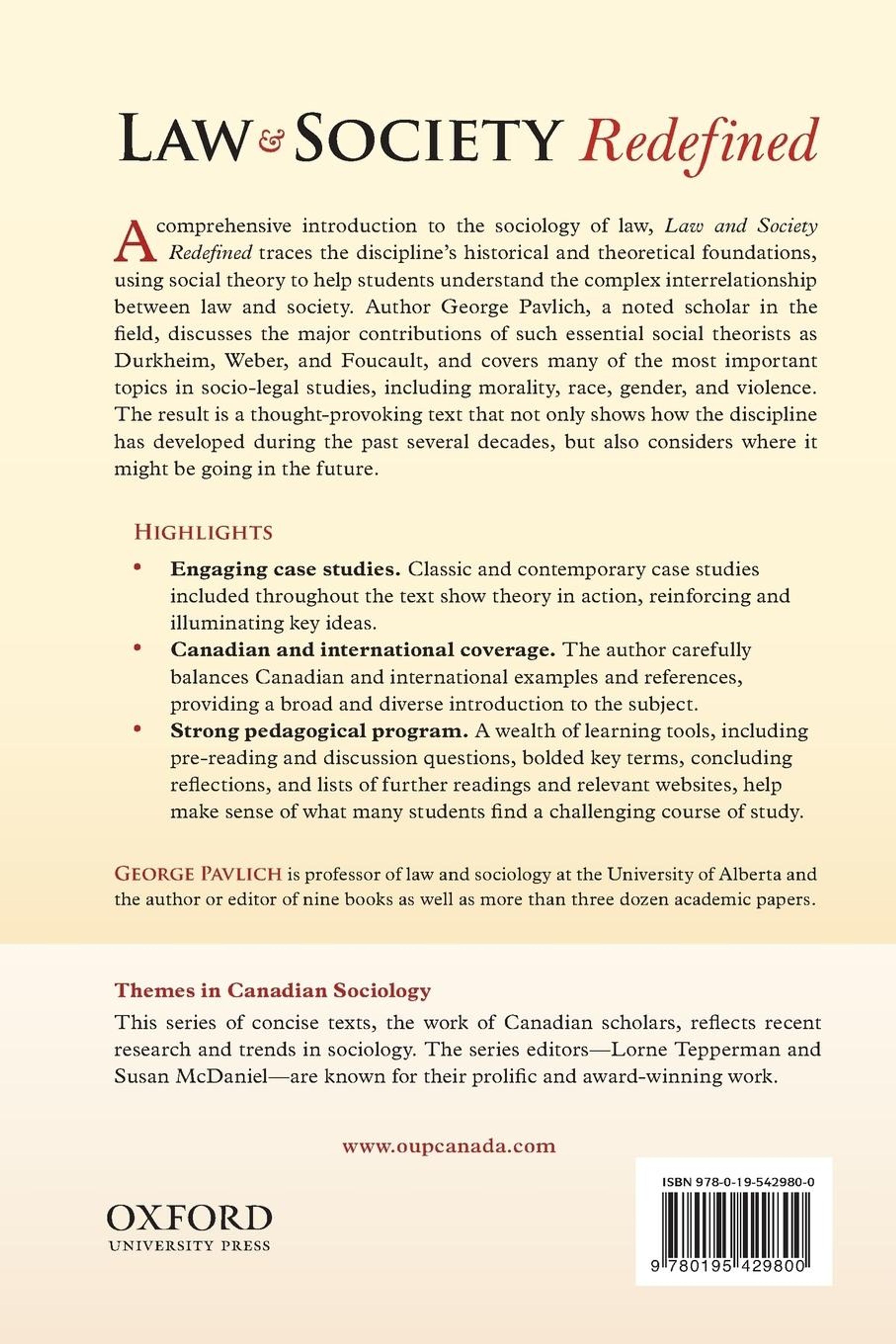 Law and Society Redefinedis a comprehensive introduction to law and society. Drawing on the foundational contributions of such prominent social theorists as Emile Durkheim, Max Weber, and Michel Foucault, author George Pavlich uses social theory to explore the relationship between law and society.