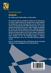 Das Buch behandelt die Hauptthemen der Grundvorlesung "Analysis", wie sie vor allem für Informatiker, aber auch für Mathematiker und Physiker geeignet ist. Das Buch beruht auf Vorlesungen, die an der Universität Oldenburg vom Autor gehalten wurden.