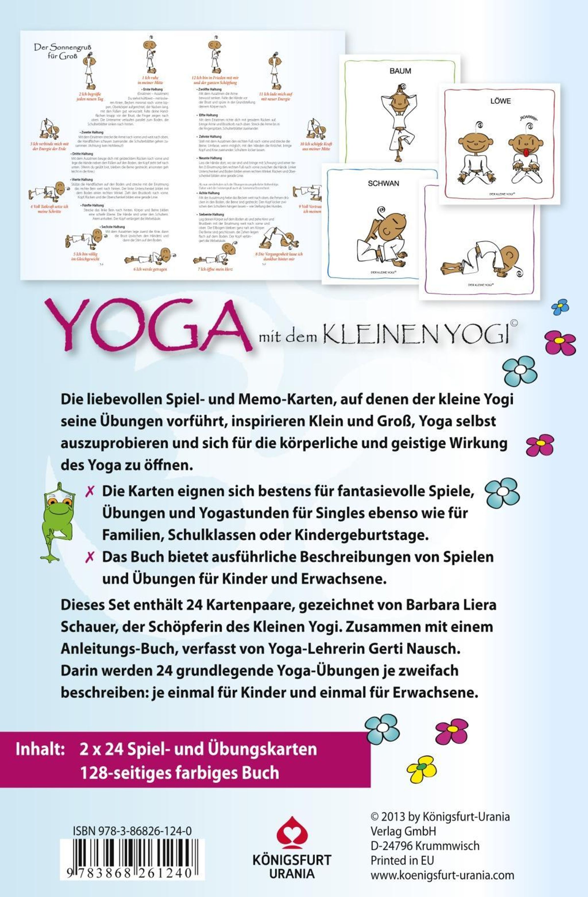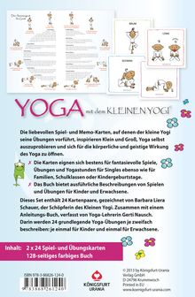 Dieses Yoga Set enthält ein Anleitungsbuch und 2 x 24 Yoga Karten (6, 5 x 6, 5 cm) in einer Stülpdeckelschachtel. Barbara Schauer hat mit dem "kleinen Yogi" eine Kultfigur geschaffen, die in fröhlichen Bildern Groß und Klein zu Bewegung animiert. Die Spiel- und Übungskarten zeigen 24 grundlegende Yoga Übungen, um die geistige und körperliche Wirkung von Yoga selbst auszuprobieren. Die Karten sind alle doppelt vorhanden, so dass sie auch als Memospiel genutzt werden können. Die Yogaexpertin und Pädagogin Gerti Nausch hat das Spiel- und Übungsbuch dazu verfasst. Alle 24 Übungen werden darin zweifach beschrieben: je eine Anleitung für Erwachsene und eine für Kinder. Das Set ist also auch für Yoga mit Kindern empfehlenswert.