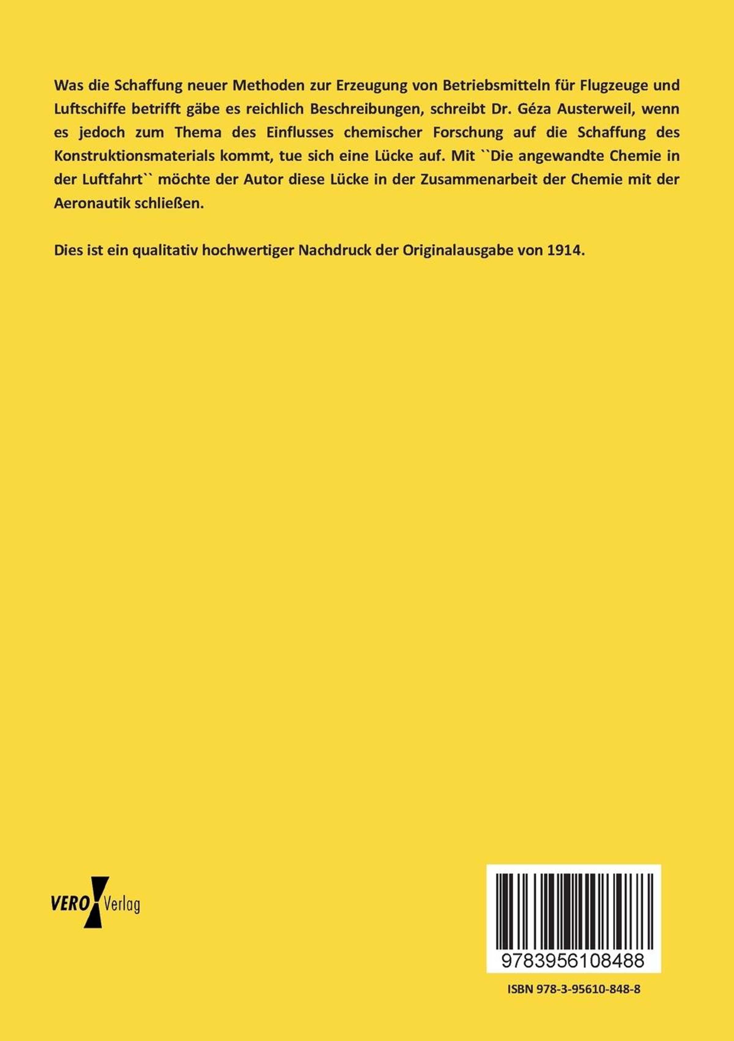 Was die Schaffung neuer Methoden zur Erzeugung von Betriebsmitteln für Flugzeuge und Luftschiffe betrifft gäbe es reichlich Beschreibungen, schreibt Dr. Géza Austerweil, wenn es jedoch zum Thema des Einflusses chemischer Forschung auf die Schaffung des Konstruktionsmaterials kommt, tue sich eine Lücke auf. Mit ``Die angewandte Chemie in der Luftfahrt`` möchte der Autor diese Lücke in der Zusammenarbeit der Chemie mit der Aeronautik schließen.