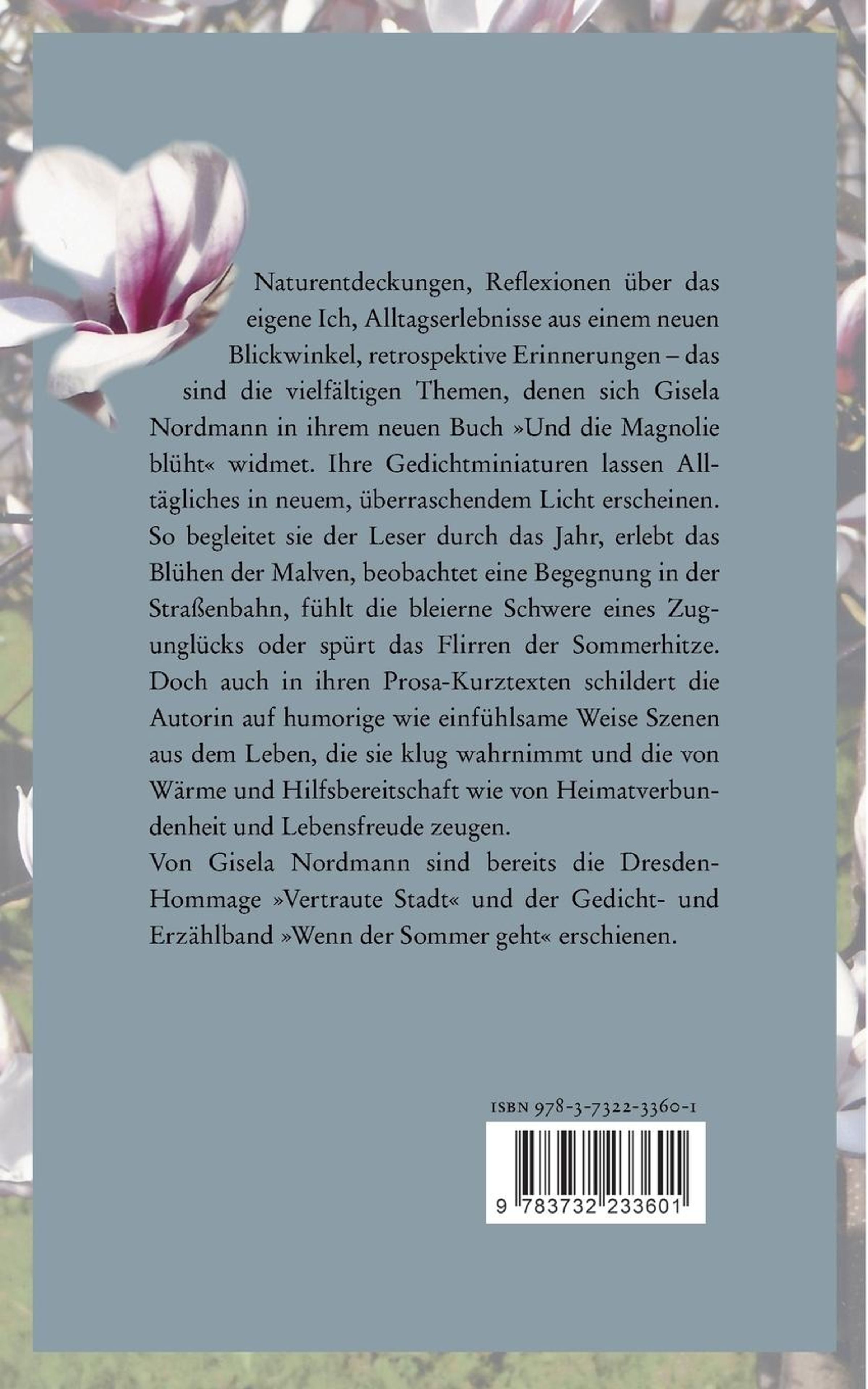 Naturentdeckungen, Reflexionen über das eigene Ich, Alltagserlebnisse aus einem neuen Blickwinkel, retrospektive Erinnerungen das sind die vielfältigen Themen, denen sich Gisela Nordmann in ihrem neuen Buch >>Und die Magnolie blüht<< widmet. Ihre Gedichtminiaturen lassen Alltägliches in neuem, überraschendem Licht erscheinen. So begleitet sie der Leser durch das Jahr, erlebt das Blühen der Malven, beobachtet eine Begegnung in der Straßenbahn, fühlt die bleierne Schwere eines Zugunglücks oder spürt das Flirren der Sommerhitze. Doch auch in ihren Prosa-Kurztexten schildert die Autorin auf humorige wie einfühlsame Weise Szenen aus dem Leben, die sie klug wahrnimmt und die von Wärme und Hilfsbereitschaft wie von Heimatverbundenheit und Lebensfreude zeugen. Von Gisela Nordmann sind bereits die Dresden-Hommage >>Vertraute Stadt<< und der Gedicht- und Erzählband >>Wenn der Sommer geht<< erschienen.