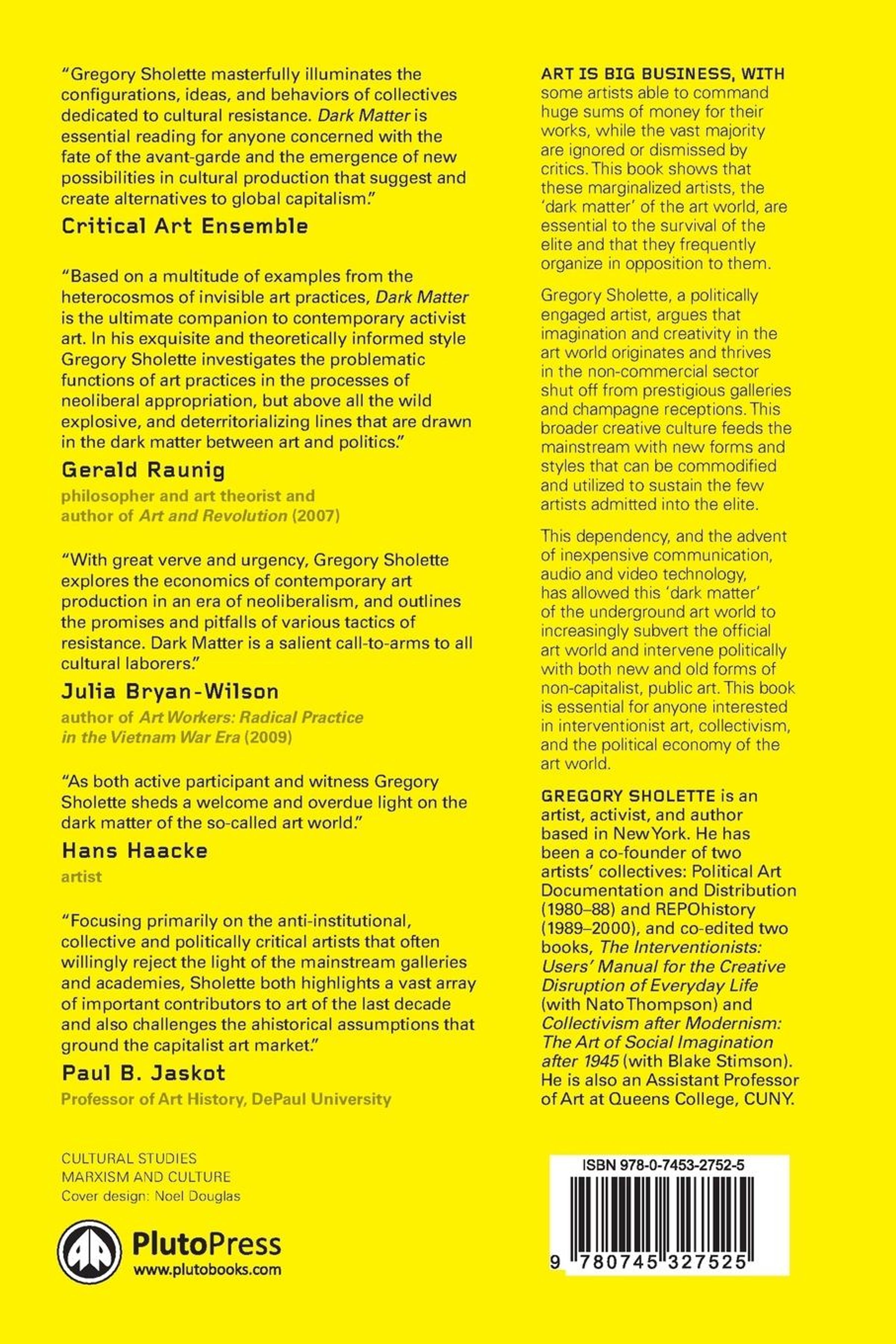 Art is big business, with some artists able to command huge sums of money for their works, while the vast majority are ignored or dismissed by critics. This book shows that these marginalised artists, the 'dark matter' of the art world, are essential to the survival of the mainstream and that they frequently organize in opposition to it. Gregory Sholette, a politically engaged artist, argues that imagination and creativity in the art world originate thrive in the non-commercial sector shut off from prestigious galleries and champagne receptions. This broader creative culture feeds the mainstream with new forms and styles that can be commodified and used to sustain the few artists admitted into the elite. This dependency, and the advent of inexpensive communication, audio and video technology, has allowed this 'dark matter' of the alternative art world to increasingly subvert the mainstream and intervene politically as both new and old forms of non-capitalist, public art. This book is essential for anyone interested in interventionist art, collectivism, and the political economy of the art world.
