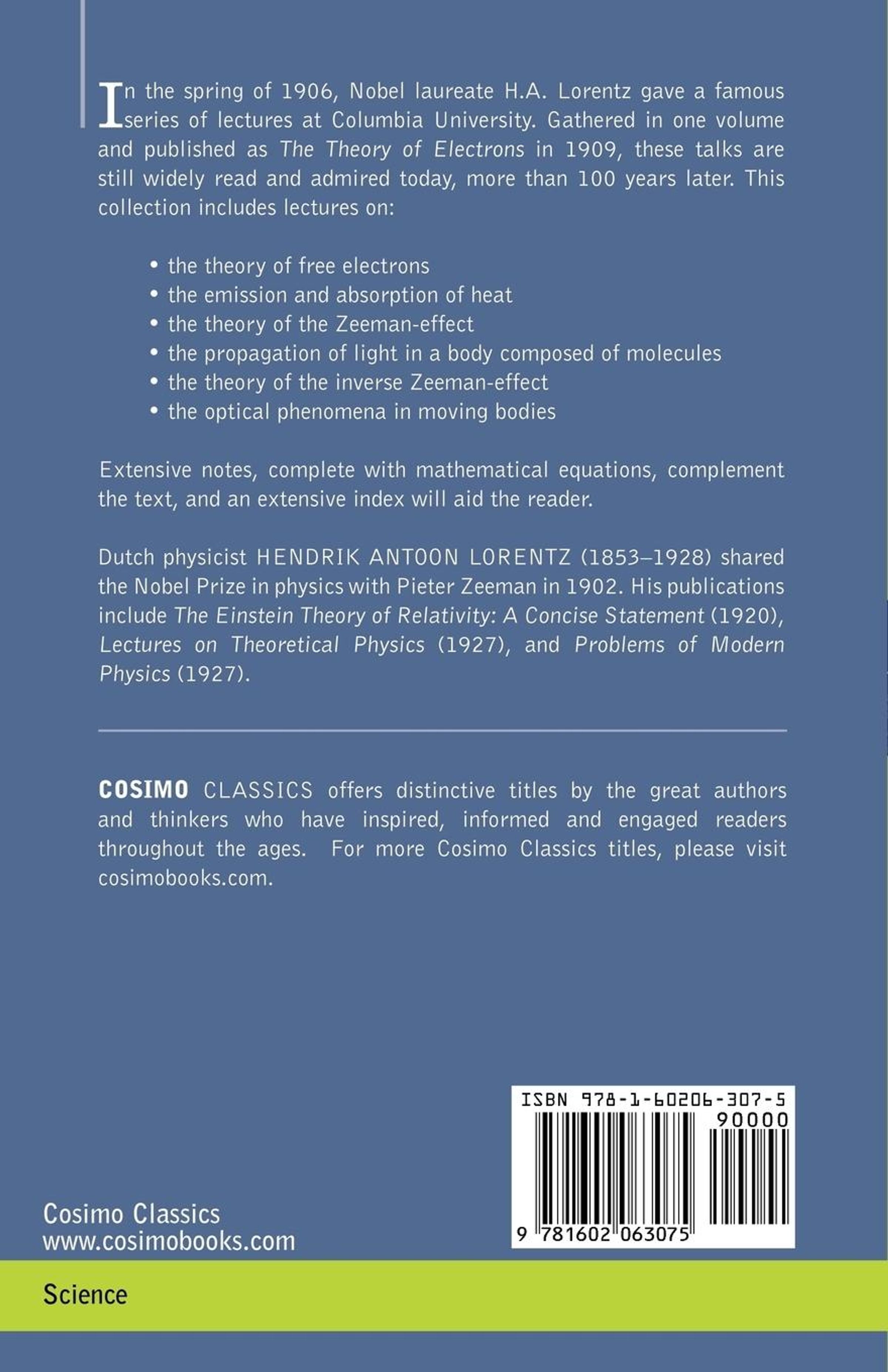 In the spring of 1906, Nobel laureate H. A. Lorentz gave a famous series of lectures at Columbia University. Gathered in one volume and published as The Theory of Electrons in 1909, these talks are still widely read and admired today, more than 100 years later. This collection includes lectures on: