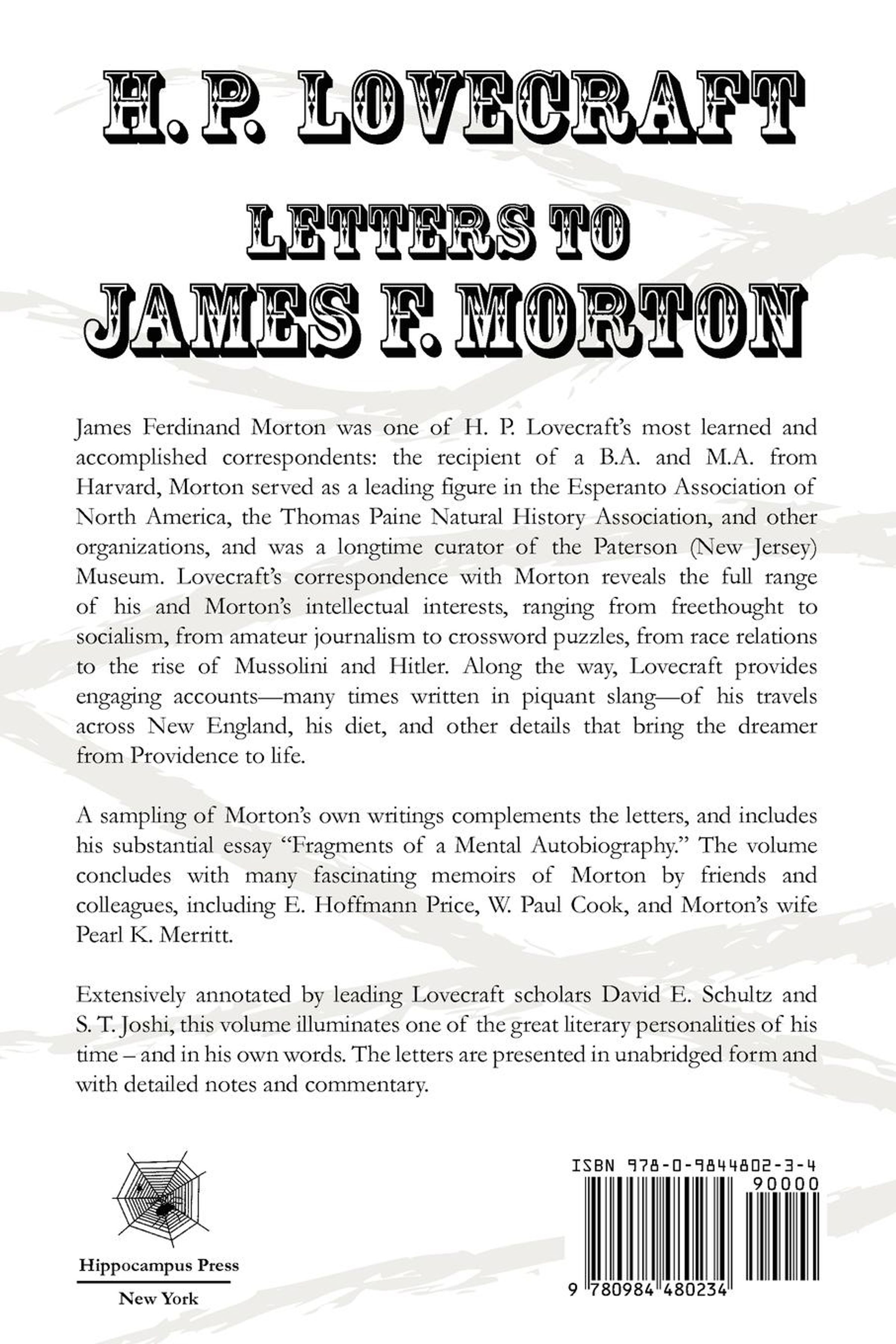 James Ferdinand Morton was one of H. P. Lovecraft's most learned and accomplished correspondents: the recipient of a B. A. and M. A. from Harvard, Morton served as a leading figure in the Esperanto Association of North America, the Thomas Paine Natural History Association, and other organizations, and was a longtime curator of the Paterson (New Jersey) Museum. Lovecraft's correspondence with Morton reveals the full range of his and Morton's intellectual interests, ranging from freethought to socialism, from amateur journalism to crossword puzzles, from race relations to the rise of Mussolini and Hitler. Along the way, Lovecraft provides engaging accounts-many times written in piquant slang-of his travels across New England, his diet, and other details that bring the dreamer from Providence to life.