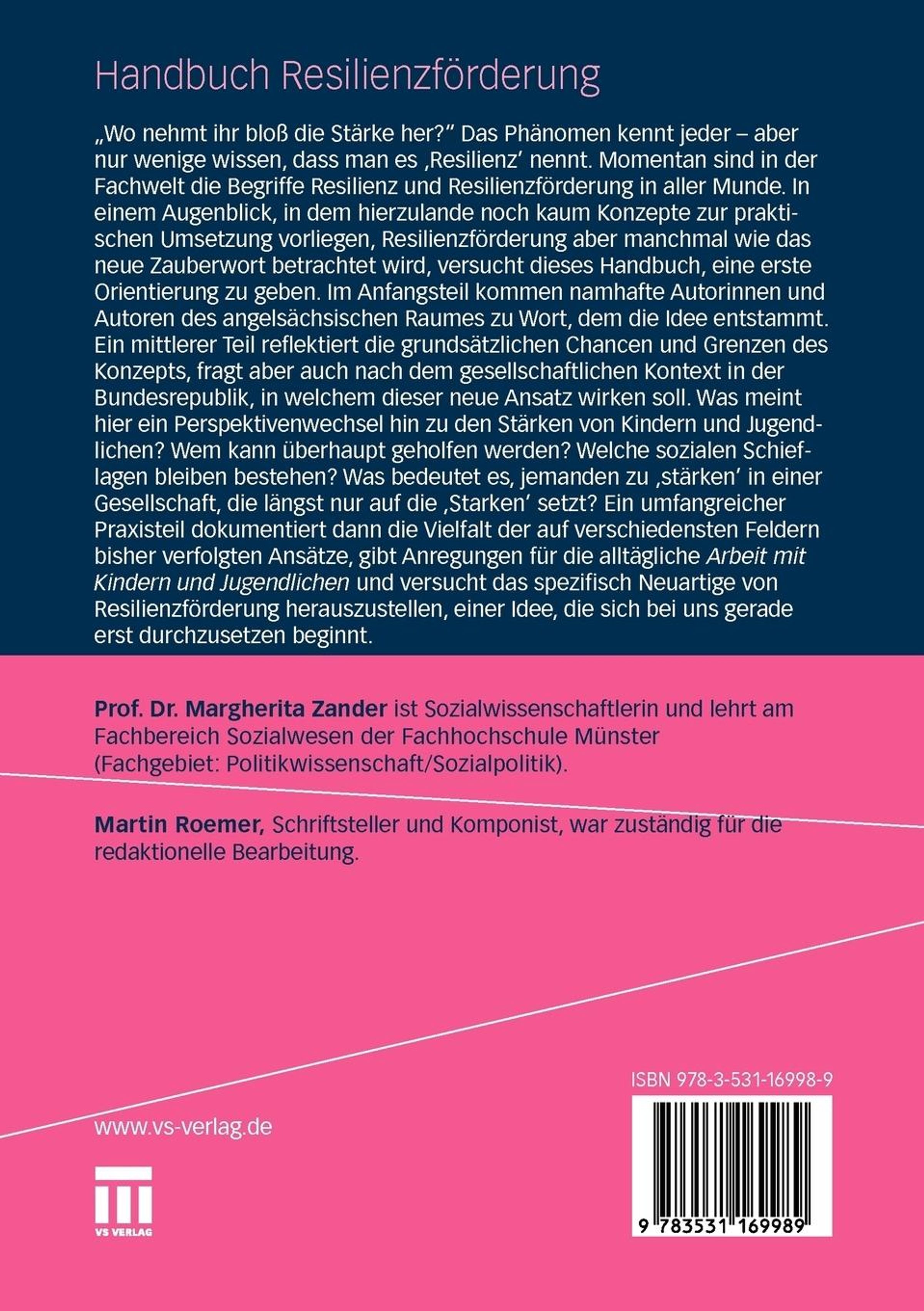 Margherita Zander, geboren 1948 in Lana bei Meran, Südtirol, ist Politikwissenschaftlerin. Nach dem Abitur Studium in Bonn mit abschließender Promotion in Kassel. Berufliche Stationen: Sozialpolitische Referentin der Bundestagsfraktion Die Grünen/Bündnis 90 (1984 - 1992). Grundsatzreferentin im Hessischen Ministerium für Jugend, Familie und Gesundheit (1992 - 1994). 1994 1997 Professorin für Politikwissenschaft und Sozialpolitik an der FH Jena, anschließend an der FH Münster (1997 - 2012). Ihre Schwerpunkte sind Kinderarmuts- und Resilienzforschung.Anmerkungen: