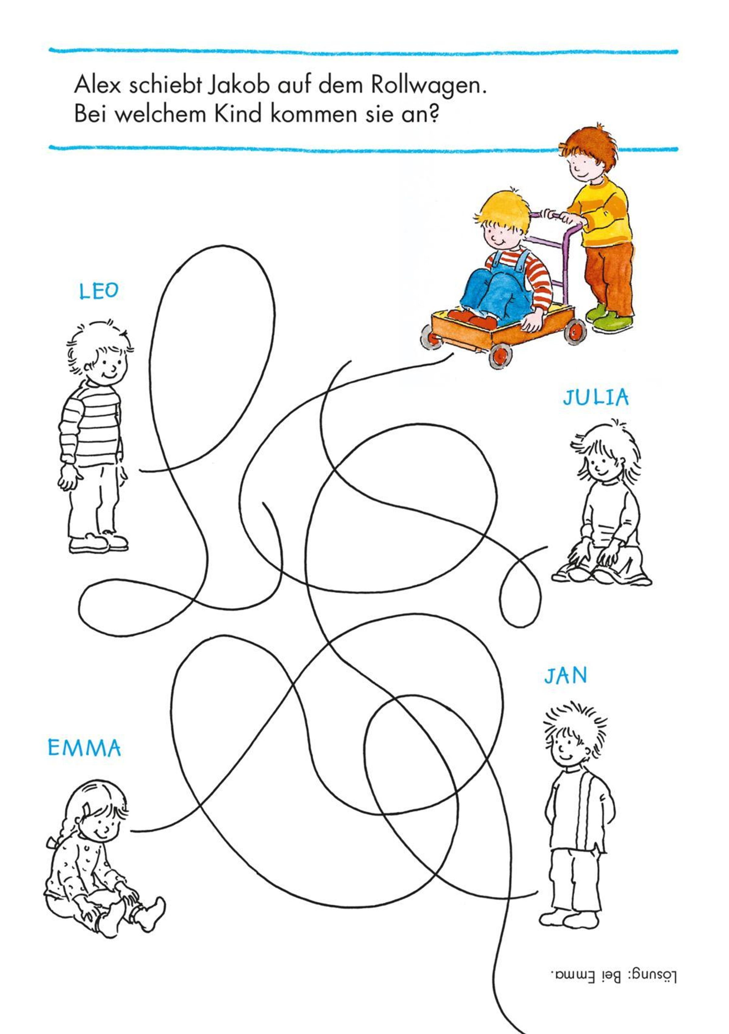 Komm mit in den Kindergarten! Was packst du dafür in seinen Rucksack? Was gibt es im Kindergarten für Spielsachen? Und was machen Jakob und seine Freunde am liebsten? In diesem Rätsel- und Ausmalblock finden Kinder ab 4 Jahren viele Aufgaben zum Spielen und Lernen. Sie lernen zuzuordnen, zu unterscheiden und verbessern ihre Feinmotorik und Konzentrationsfähigkeit. Erste Malrätsel Farben und Formen erkennen Labyrinthe und Suchbilder Finger- und Bewegungsspiele In Zusammenarbeit mit Pädagogen entwickelt.