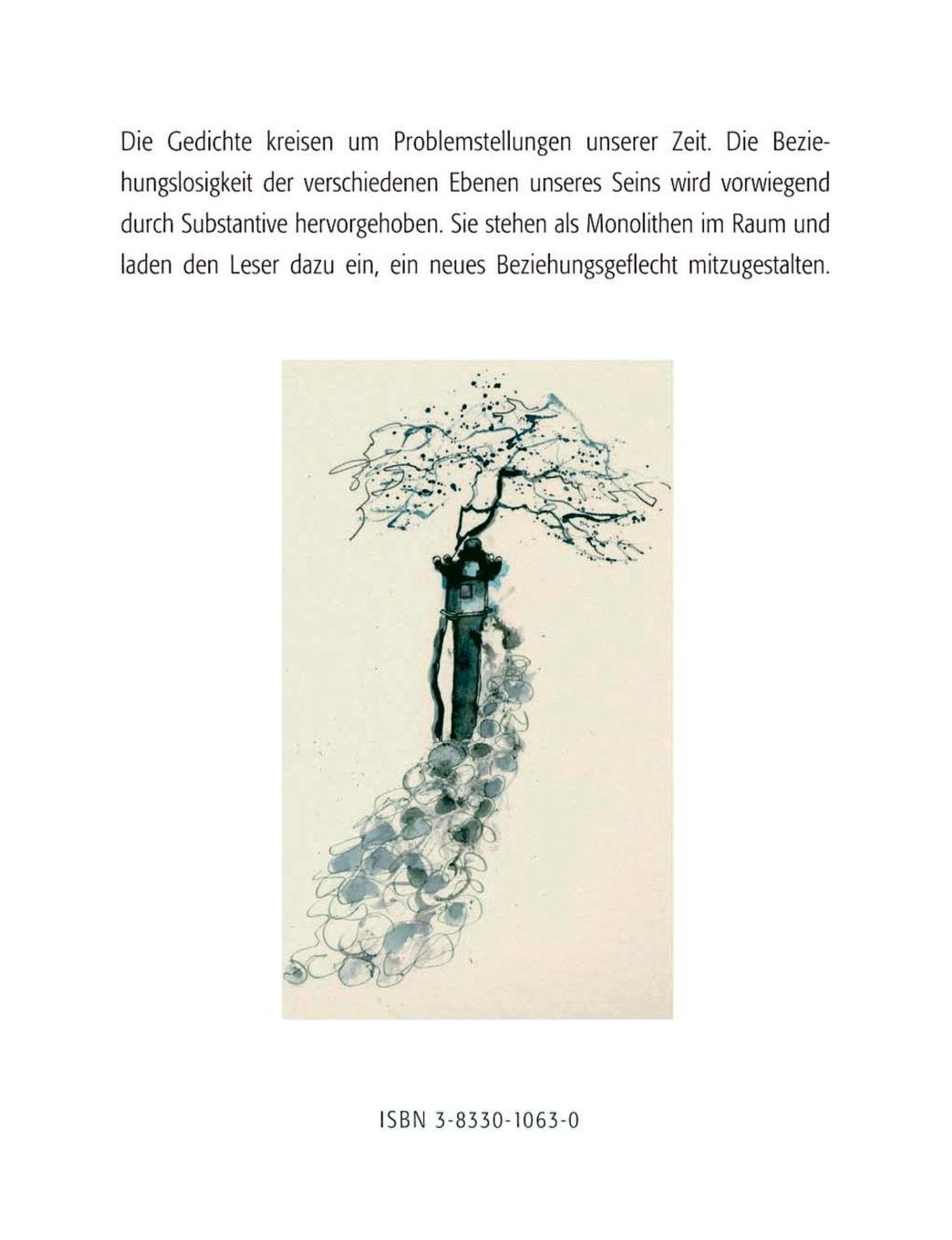 Die Gedichte kreisen um Problemstellungen unserer Zeit. Die Beziehungslosigkeit der verschiedenen Ebenen unseres Seins wird vorwiegend durch Substantive hervorgehoben. Sie stehen als Monolithen im Raum und laden den Leser dazu ein, ein neues Beziehungsgeflecht mitzugestalten.