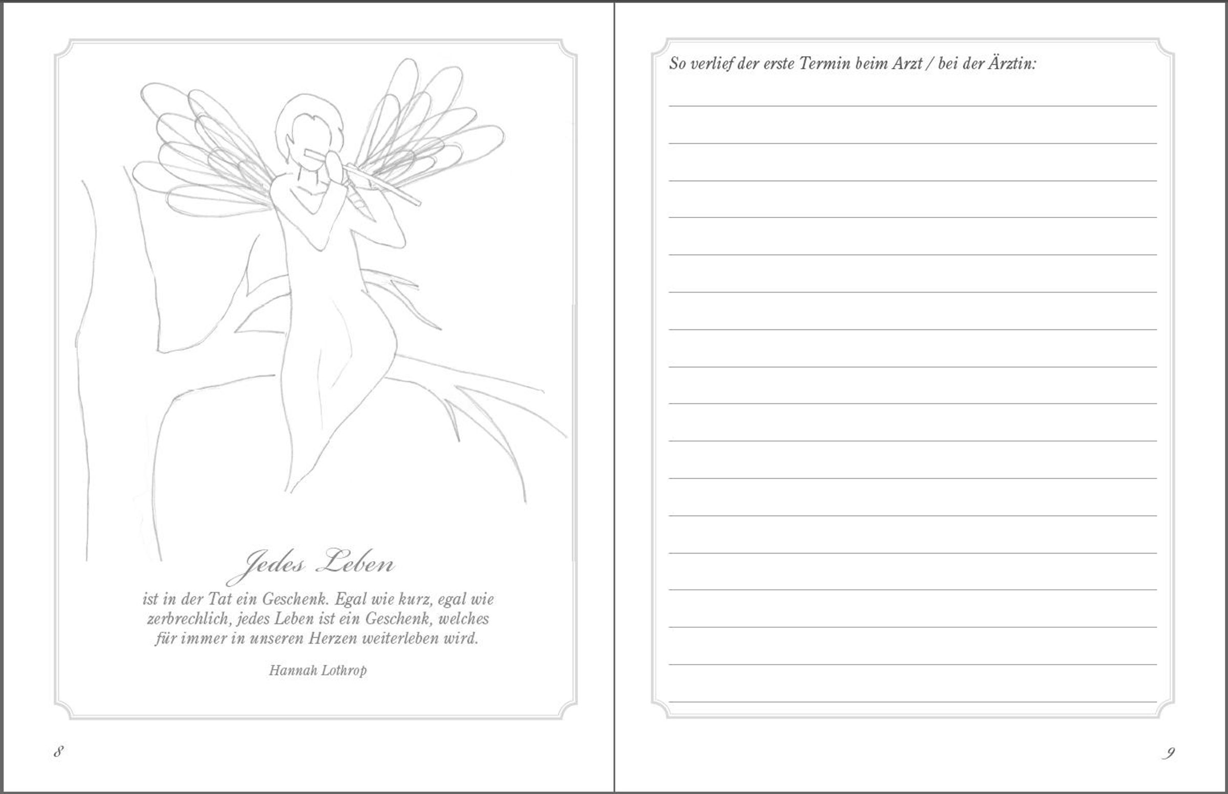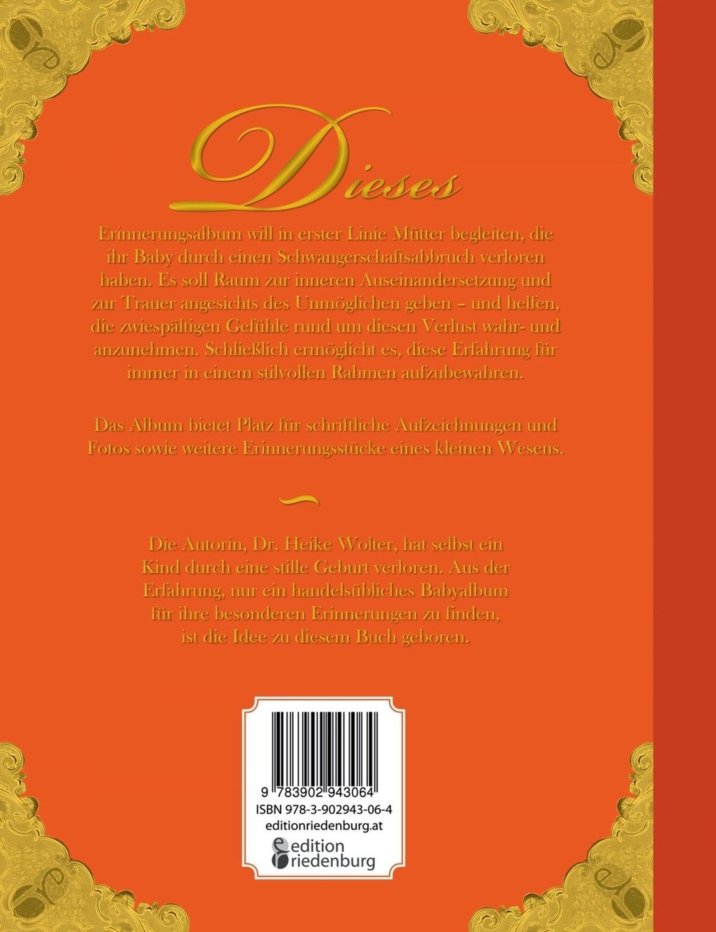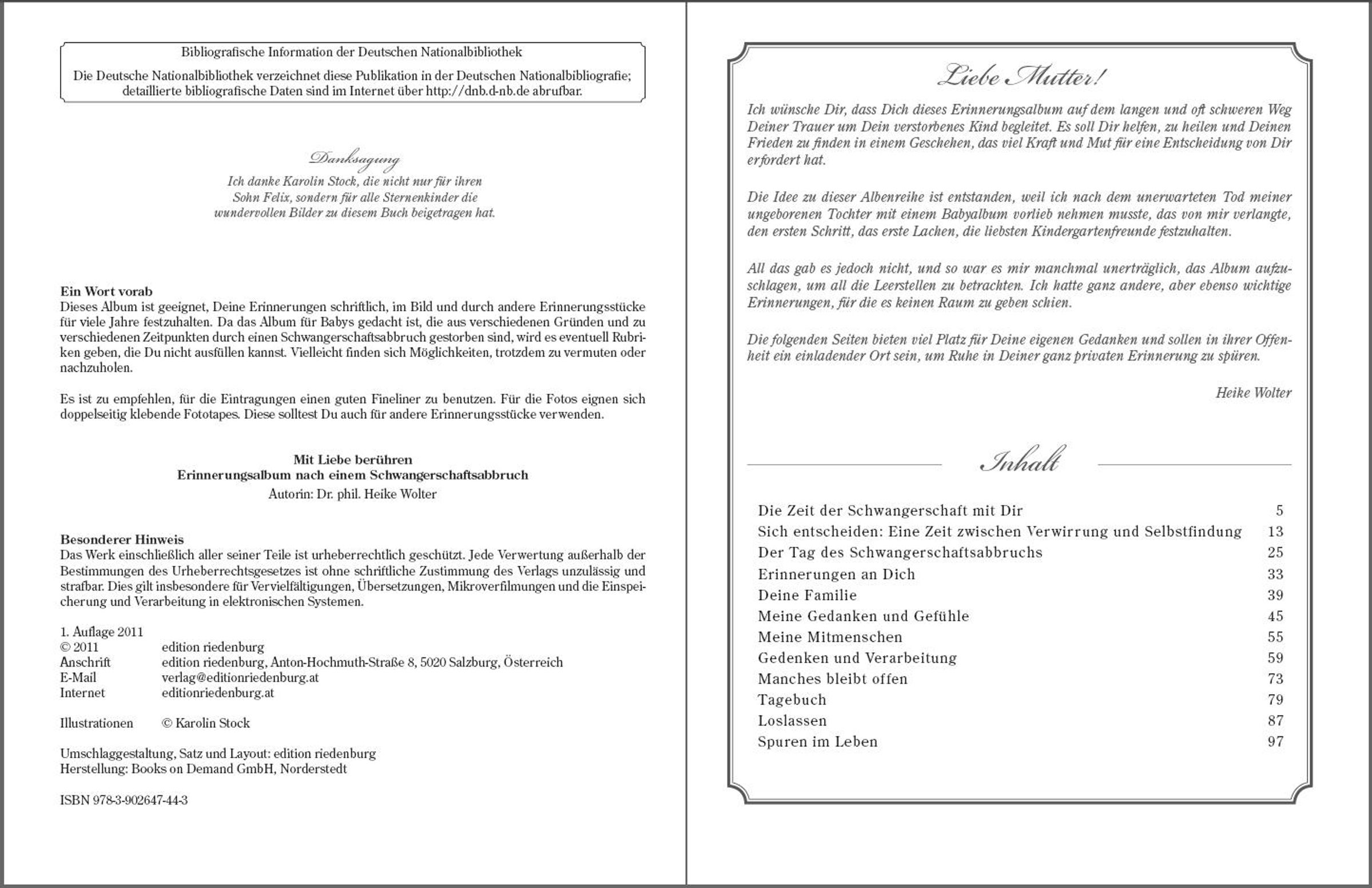 Dieses Erinnerungsalbum will in erster Linie Mütter begleiten, die ihr Baby durch einen Schwangerschaftsabbruch verloren haben. Es soll Raum zur inneren Auseinandersetzung und zur Trauer angesichts des Unmöglichen geben - und helfen, die zwiespältigen Gefühle rund um diesen Verlust wahr- und anzunehmen. Schließlich ermöglicht es, diese Erfahrung für immer in einem stilvollen Rahmen aufzubewahren. Das Album bietet Platz für schriftliche Aufzeichnungen und Fotos sowie weitere Erinnerungsstücke eines kleinen Wesens. *** Die Autorin, Dr. Heike Wolter, hat selbst ein Kind durch eine stille Geburt verloren. Aus der Erfahrung, nur ein handelsübliches Babyalbum für ihre besonderen Erinnerungen zu finden, ist die Idee zu diesem Buch geboren. www. heikewolter. de