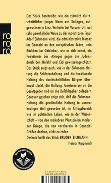 "Daß Stück zeigt auch, wie in der Eichmann-Haltung die Soldatenhaltung und die funktionale Haltung des durchschnittlichen Bürgers überhaupt steckt, die Haltung, Gewissen sei an die Gesetzgeber und an die Befehlsgeber delegiert. Genauer gesehen zeigt sich, daß die Eichmann-Haltung die gewöhnliche Haltung in unserer gewöhnlichen Welt geworden ist, im Alltagsbereich wie im politischen Leben, wie in der Wissenschaft - von den makabren Planspielen moderner Kriege, die von vornherein in Genozid-Größen denken, nicht zu reden. Deshalb heißt das Stück BRUDER EICHMANN." (Heinar Kipphardt)