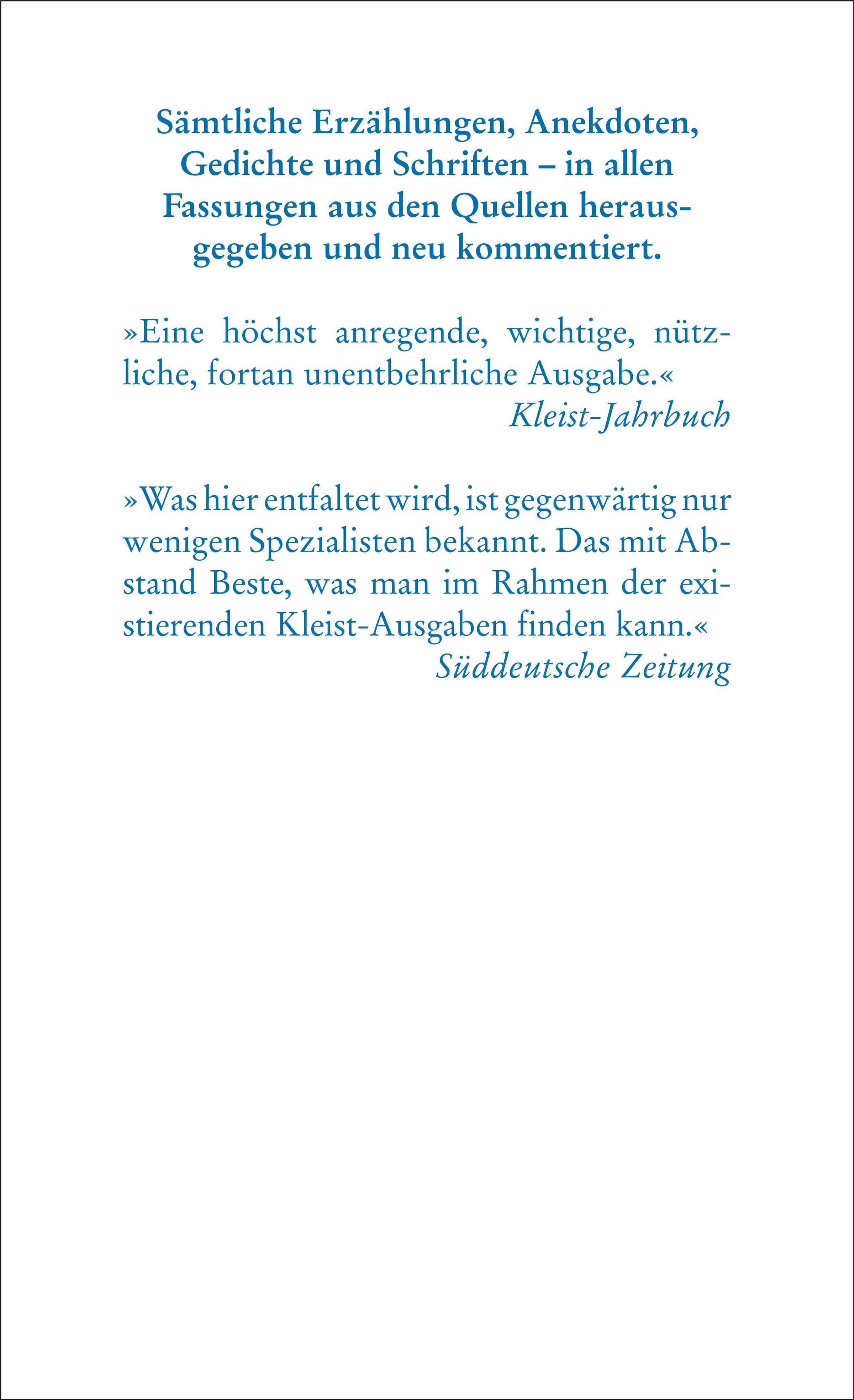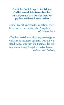 Enthält neben sämtlichen Erzählungen die Schriften zu Politik, Philosophie und Kunst, die Gedichte und journalistischen Beiträge Alle Texte nach den frühesten Zeugen, sofern möglich, nach Kleists HandschriftenErstmals in einer Ausgabe Abdruck mehrerer Fassungen im Paralleldruck Heinrich von Kleist war ein Prosa-Autor allerersten Ranges. Er machte aus der deutschsprachigen Anekdote eine äußerst konzentrierte, wirkungsintensive Kunstform und hob sie auf eine später nur selten wieder erreichte Höhe. Die überlieferte Novellenform schuf er so um, daß sie die Problematik des Individuums in der modernen Welt kompromißlos auszudrücken vermochte. Dabei erreichte Kleist ein Höchstmaß an erzählerischer Spannung. Dieser Band umfaßt neben den Erzählungen die kleineren Prosatexte, die Widmungen und Albumblätter und die Gedichte, sodann die größeren politischen Schriften und die zu Philosophie und Kunst, schließlich die vielfältigen kleineren Beiträge in den >Berliner Abendblättern< bis hin zu den redaktionellen Anzeigen und Erklärungen. Die meisten Novellen Kleists haben erst in einem komplizierten Prozeß der Um- und Neugestaltung ihre endgültige Form gefunden. Daher werden - erstmals in einer Ausgabe - mehrere Texte in Paralleldruck geboten, um dem Leser einen unmittelbaren Eindruck von Kleists Arbeitsweise und Aufschlüsse über die Absichten dieses in so vieler Hinsicht rätselhaften Dichters zu geben.