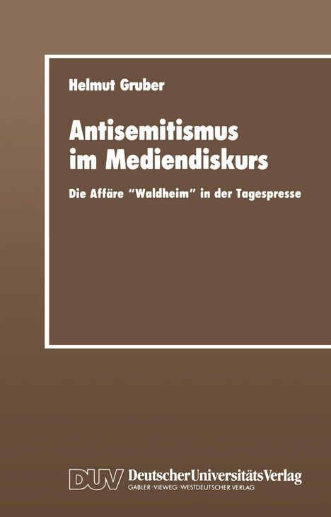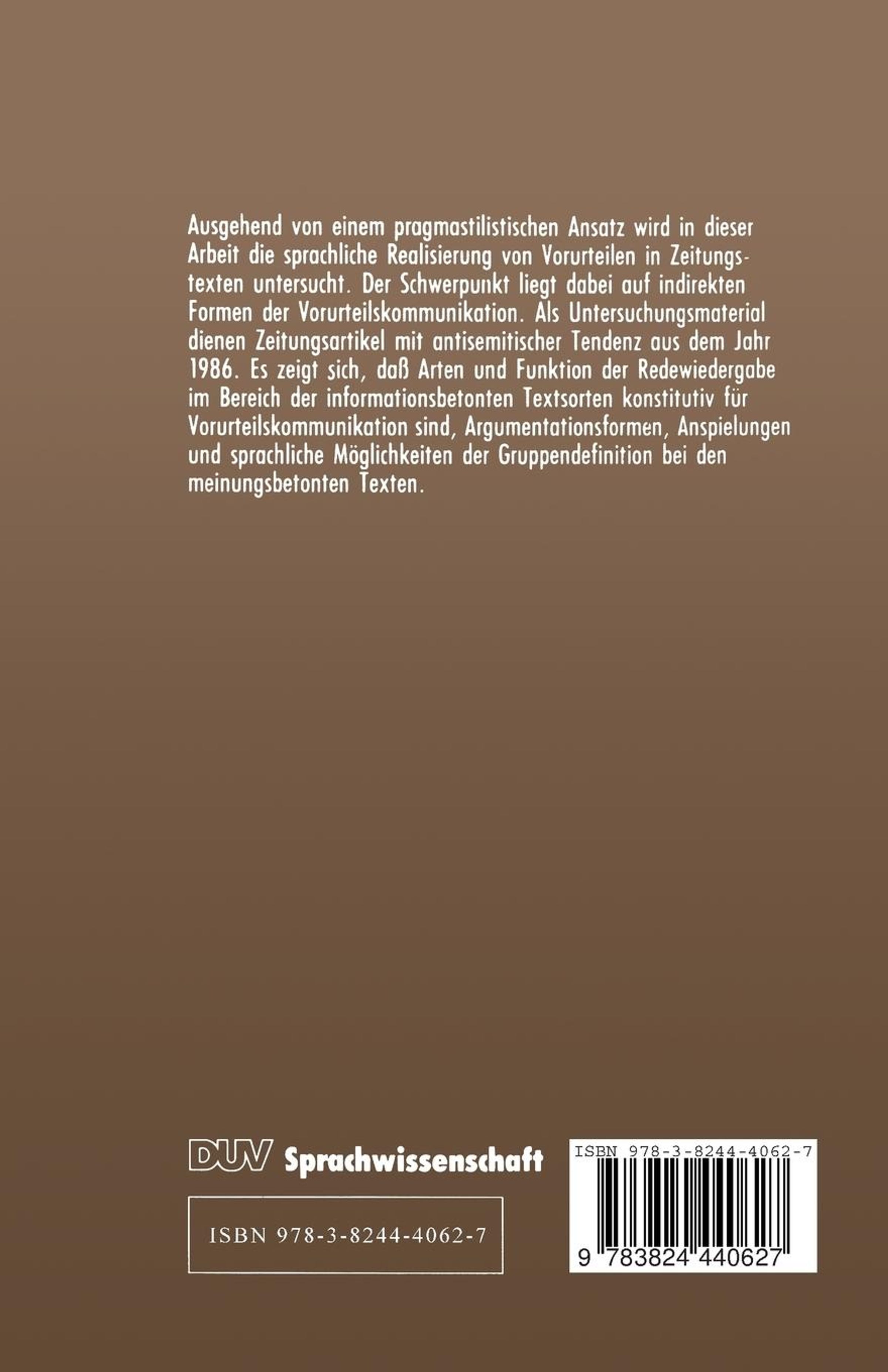 - Theoretische Vorüberlegungen.- 1.1. Sprache und Vorurteil.- 1.2. Sprache und Ideologie - Sprache und Politik.- 1.3. Nachrichtenproduktion - Mythen und Fakten.- 1.4. Methodisches Vorgehen.- 2. Die Affäre "Waldheim".- 2.1. Historischer Abriß.- 2.2. Auswahlkriterien und Materialübersicht 60.- 3. Die inhaltliche Analyse - Inhalte und Werte, die die Affäre bestimmten.- 3.1. Antisemitische Inhalte.- 3.2. Resümee.- 3.3. Ein Spitzenpolitiker nimmt Stellung: Normen und Werte der "Österreicher".- 3.4. "Wir" und "die Juden" - zur Integration der Ergebnisse der inhaltlichen Untersuchung.- 4. Strukturanalyse der berichtenden Textsorten.- 4.1. "Berichten" als eine Grundform der Medienberichterstattung.- 4.2. Empirisch auftretende Texttypen.- 4.3. Möglichkeiten der Vorurteilsäußerung auf subtextueller Ebene.- 4.4. Die implizite Kategorisierung von Ereignissen - Die Perspektive der Affäre "Waldheim" in den Zeitungen.- 5. Strukturanalyse der meinungsbetonten Textsorten.- 5.1. Der deskriptiv-narrative Texttyp.- 5.2. Der argumentative Texttyp.- 5.3. Antisemitische Argumentationsstrategien.- 5.4. Vorurteilsvermittlung auf der subtextuellen Ebene.- 6. Integration der Ergebnisse.- 6.1. Die politische Funktionalisierung antisemitischer Vorurteile im österreichischen Präsidentschaftswahlkampf 1986 durch zwei Tageszeitungen.- 6.2. Skizze eines Modells der Vorurteilsvermittlung im massenmedialen Bereich.- 6.3. Ausblick.- Literatur.