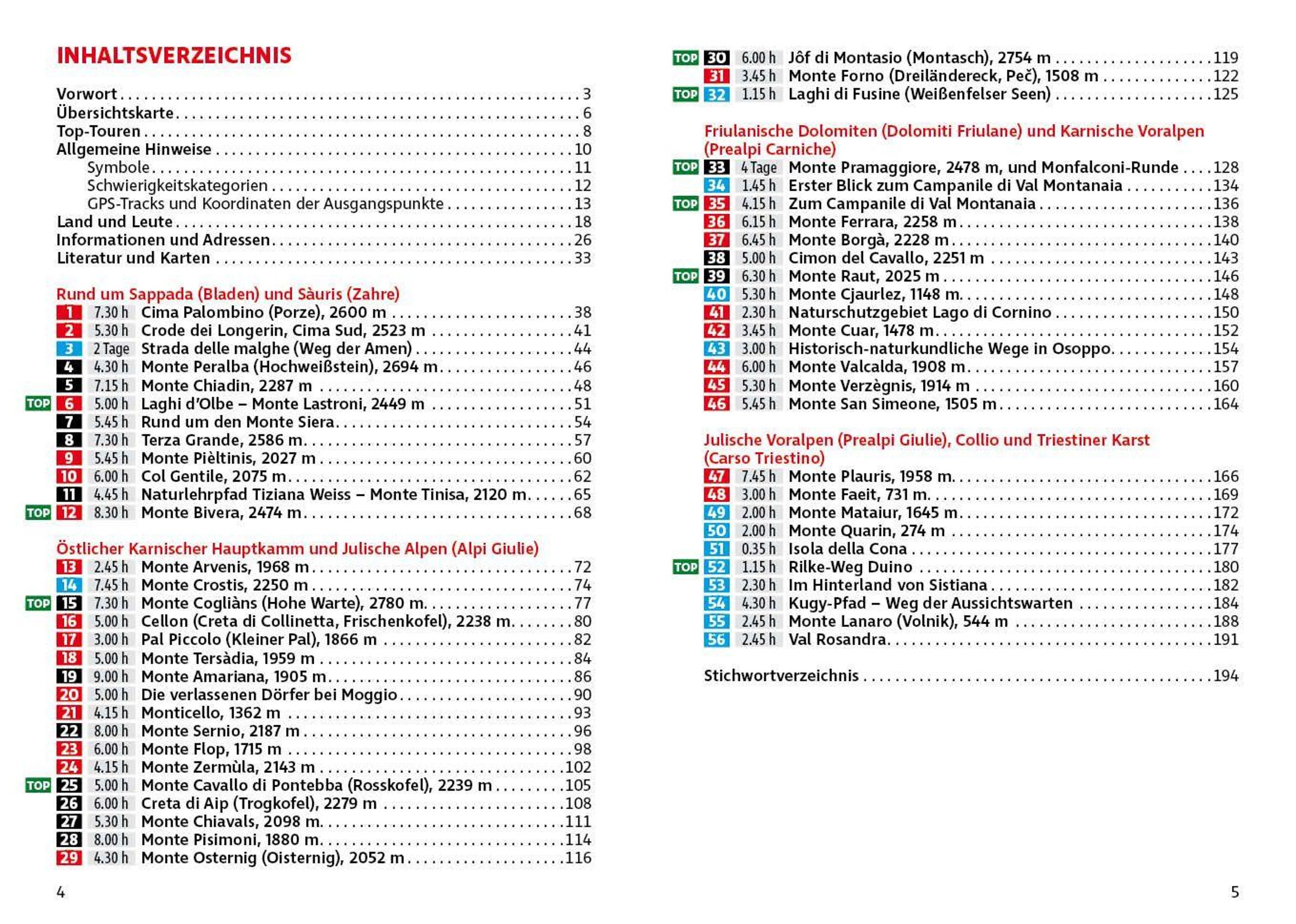 - 56 Höhenprofile, 56 Wanderkärtchen im Maßstab 1:25.000 bis 1:100.000 sowie zwei Übersichtskarten im Maßstab 1:800.000 und 1:1.400.000