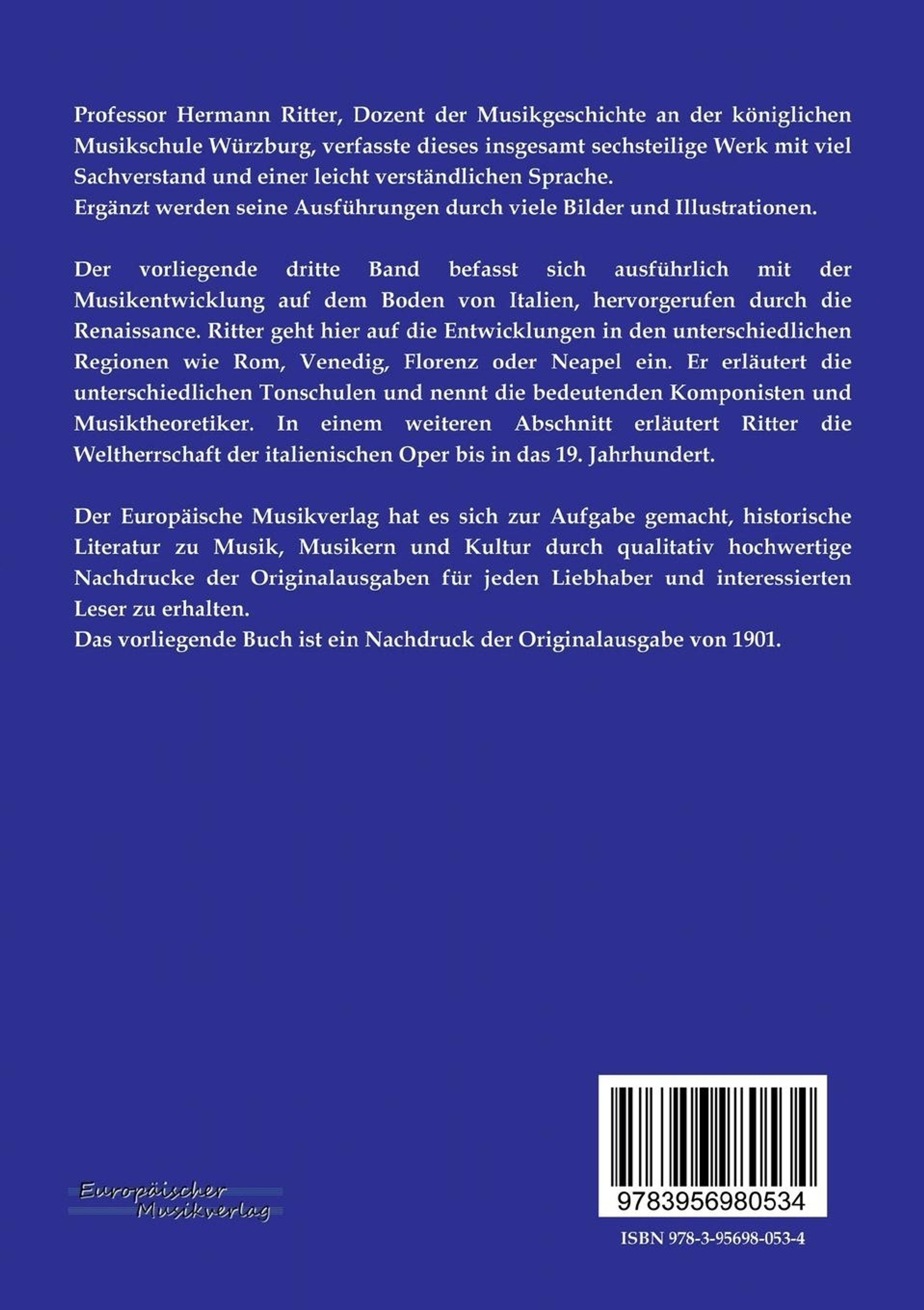 Der vorliegende dritte Band befasst sich ausführlich mit der Musikentwicklung auf dem Boden von Italien, hervorgerufen durch die Renaissance. Ritter geht hier auf die Entwicklungen in den unterschiedlichen Regionen wie Rom, Venedig, Florenz oder Neapel ein. Er erläutert die unterschiedlichen Tonschulen und nennt die bedeutenden Komponisten und Musiktheoretiker. In einem weiteren Abschnitt erläutert Ritter die Weltherrschaft der italienischen Oper bis in das 19. Jahrhundert.