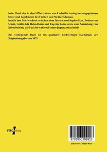 Erster Band der in den 1870er Jahren von Ludmilla Assing herausgegebenen Briefe und Tagebücher des Fürsten von Pückler-Muskau. Enthält den Briefwechsel zwischen dem Fürsten und Sophie Han, Bettina von Armin, Gräfin Ida Hahn-Hahn und Eugenie John sowie eine Sammlung von Liebesbriefen, die Pückler während seiner Jugendzeit schrieb.