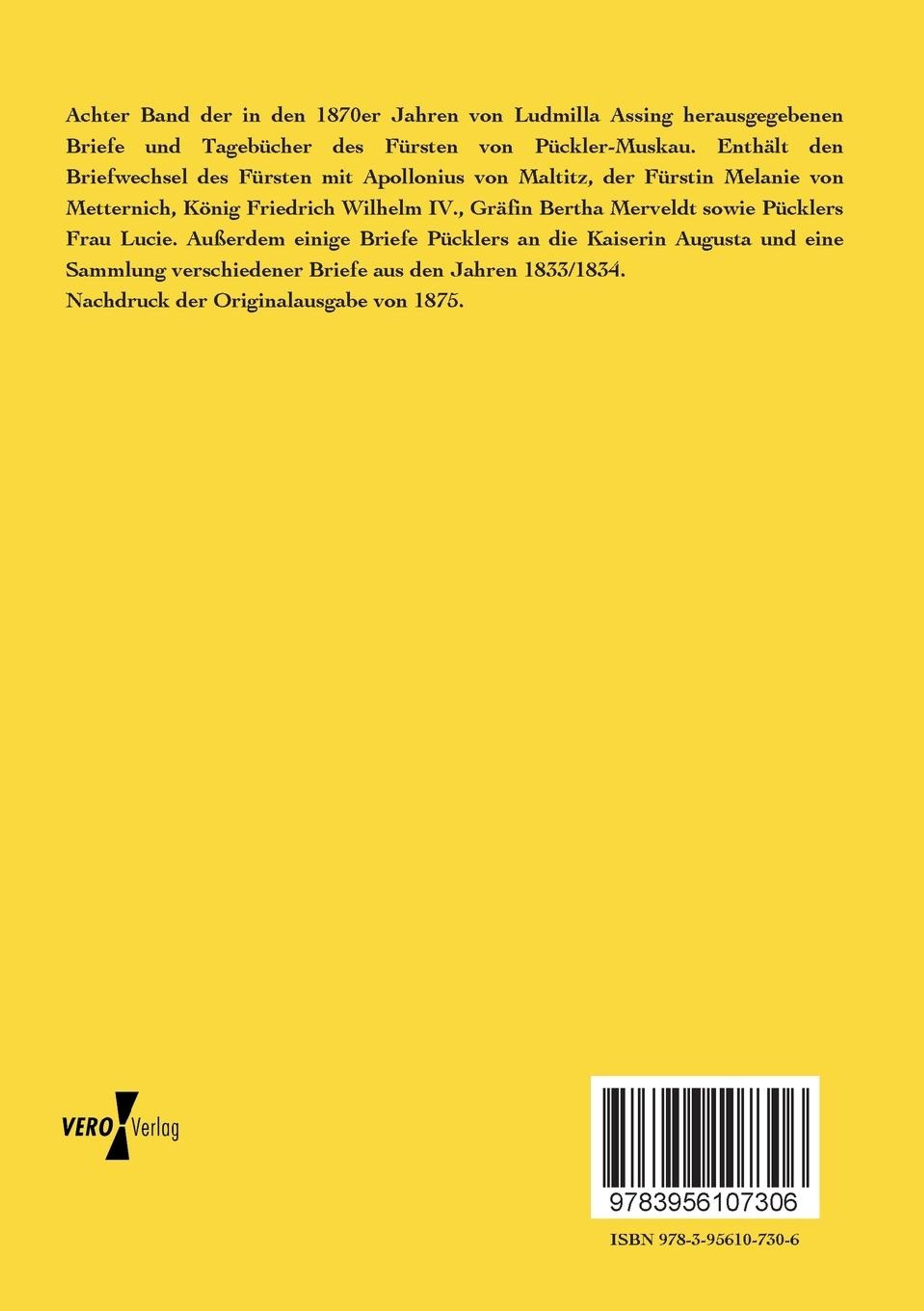 Achter Band der in den 1870er Jahren von Ludmilla Assing herausgegebenen Briefe und Tagebücher des Fürsten von Pückler-Muskau. Enthält den Briefwechsel des Fürsten mit Apollonius von Maltitz, der Fürstin Melanie von Metternich, König Friedrich Wilhelm IV., Gräfin Bertha Merveldt sowie Pücklers Frau Lucie. Außerdem einige Briefe Pücklers an die Kaiserin Augusta und eine Sammlung verschiedener Briefe aus den Jahren 1833 / 1834. Nachdruck der Originalausgabe von 1875.