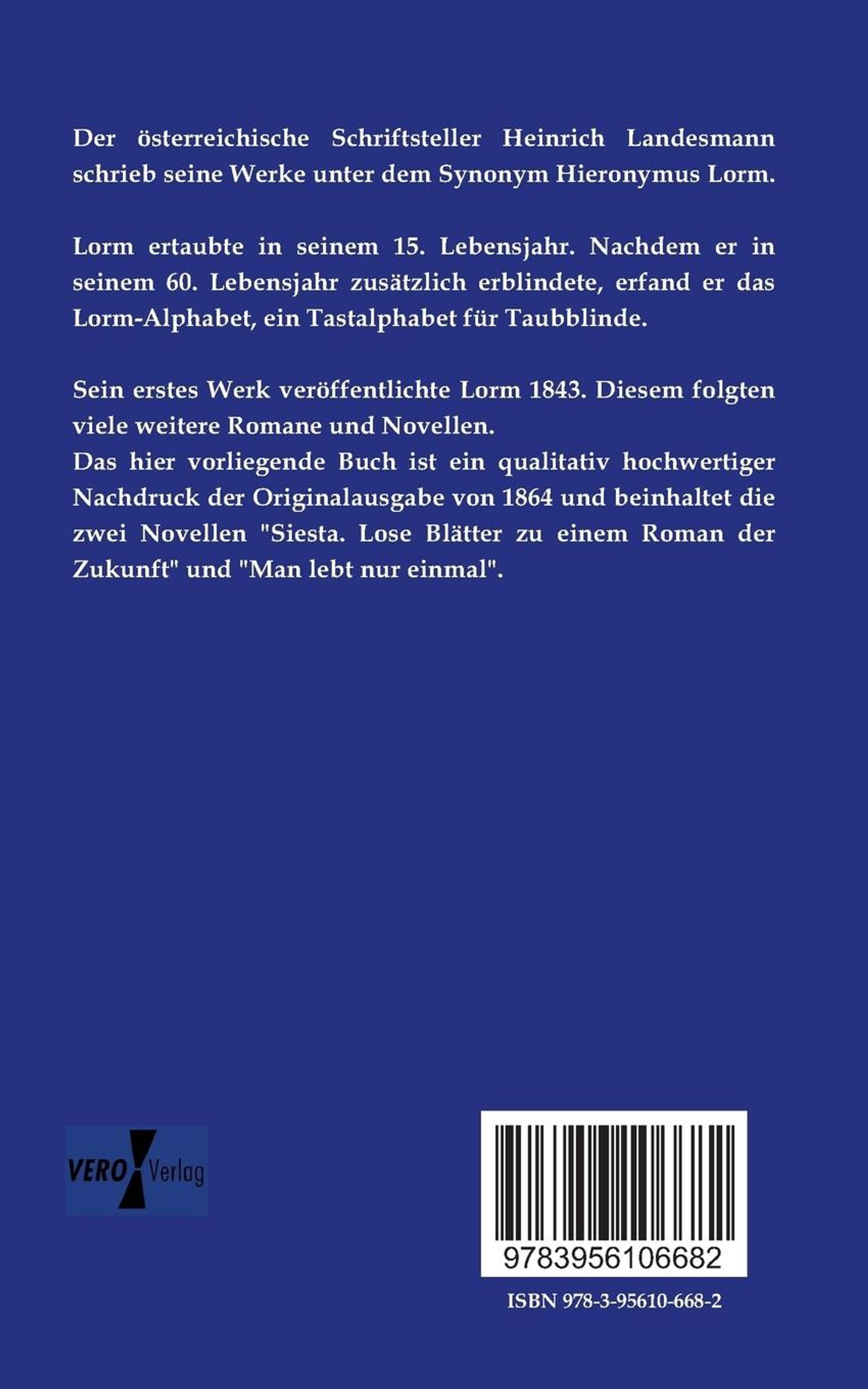 Sein erstes Werk veröffentlichte Lorm 1843. Diesem folgten viele weitere Romane und Novellen. Das hier vorliegende Buch ist ein qualitativ hochwertiger Nachdruck der Originalausgabe von 1864 und beinhaltet die zwei Novellen \"Siesta. Lose Blätter zu einem Roman der Zukunft\" und \"Man lebt nur einmal\".