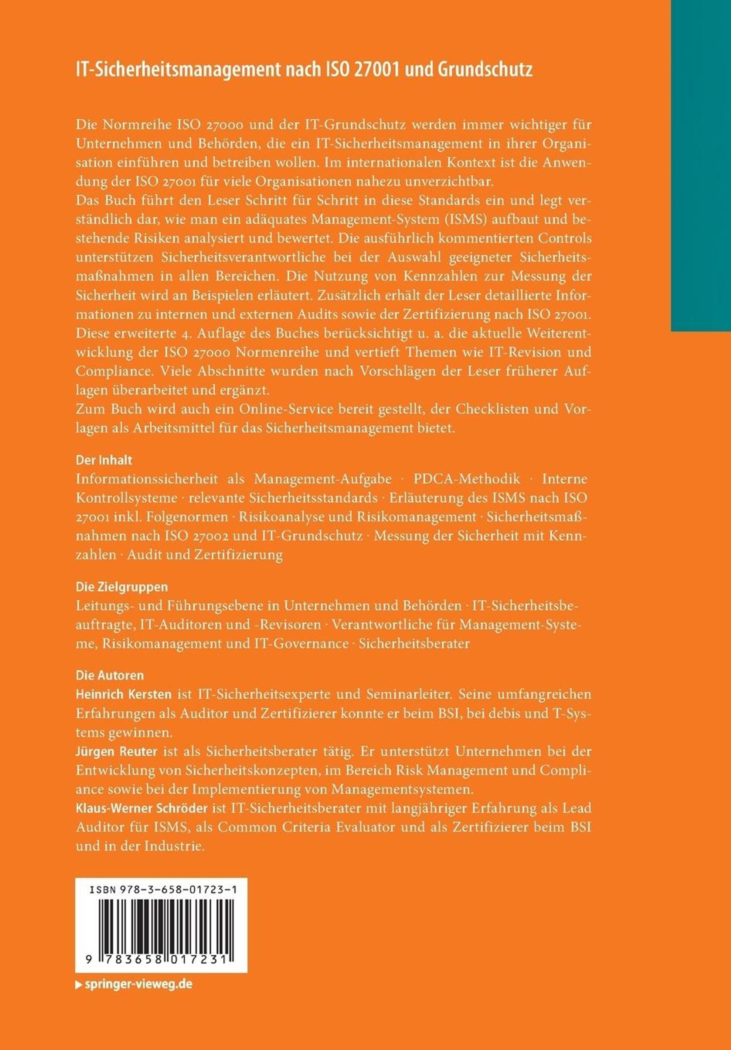 Diese erweiterte 4. Auflage des Buches berücksichtigt u. a. die aktuelle Weiterentwicklung der ISO 27000 Normenreihe und vertieft Themen wie IT-Revision und Compliance. Viele Abschnitte wurden nach Vorschlägen der Leser früherer Auflagen überarbeitet und ergänzt. Zum Buch wird auch ein Online-Service bereit gestellt, der Checklisten und Vorlagen als Arbeitsmittel für das Sicherheitsmanagement bietet.