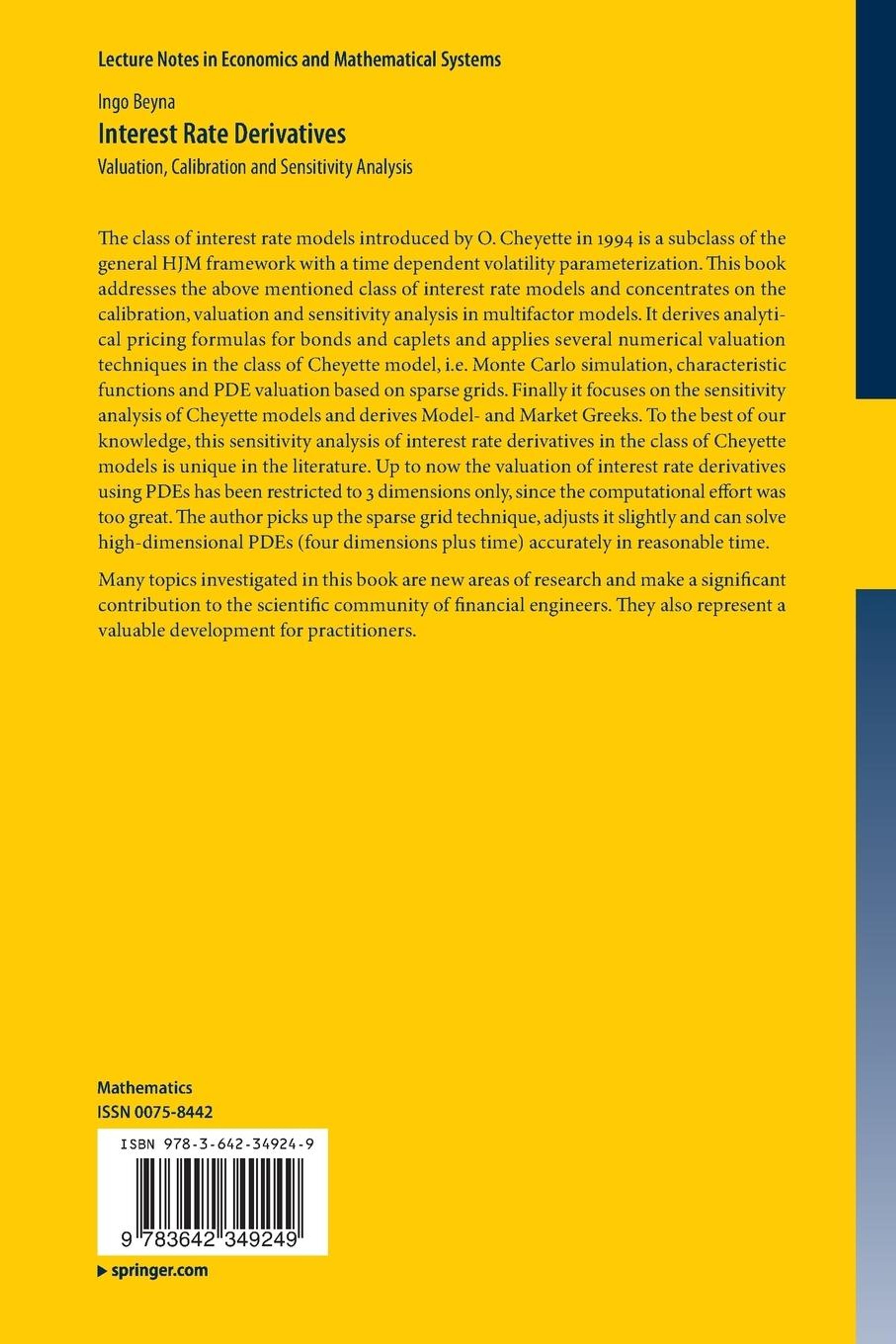 The class of interest rate models introduced by O. Cheyette in 1994 is a subclass of the general HJM framework with a time dependent volatility parameterization. This book addresses the above mentioned class of interest rate models and concentrates on the calibration, valuation and sensitivity analysis in multifactor models. It derives analytical pricing formulas for bonds and caplets and applies several numerical valuation techniques in the class of Cheyette model, i. e. Monte Carlo simulation, characteristic functions and PDE valuation based on sparse grids. Finally it focuses on the sensitivity analysis of Cheyette models and derives Model- and Market Greeks. To the best of our knowledge, this sensitivity analysis of interest rate derivatives in the class of Cheyette models is unique in the literature. Up to now the valuation of interest rate derivatives using PDEs has been restricted to 3 dimensions only, since the computational effort was too great. The author picks up the sparse grid technique, adjusts it slightly and can solve high-dimensional PDEs (four dimensions plus time) accurately in reasonable time. Many topics investigated in this book are new areas of research and make a significant contribution to the scientific community of financial engineers. They also represent a valuable development for practitioners.