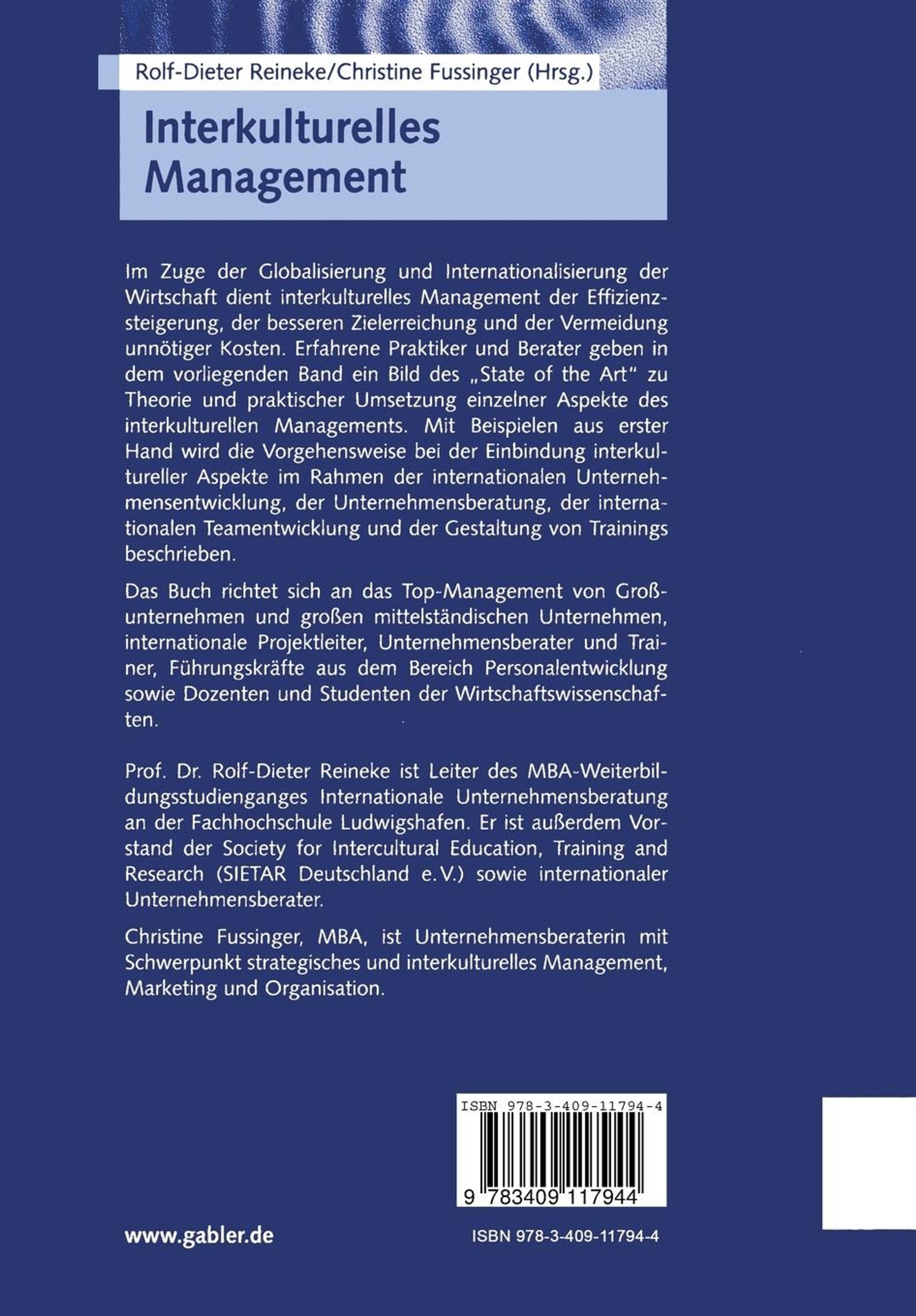 Prof. Dr. Rolf-Dieter Reineke ist Leiter des MBA-Weiterbildungsstudienganges Internationale Unternehmensberatung an der Fachhochschule Ludwigshafen. Er ist außerdem Vorstand der Society for Intercultural Education, Training and Research (SIETAR Deutschland e.V.) sowie internationaler Unternehmensberater.Anmerkungen: