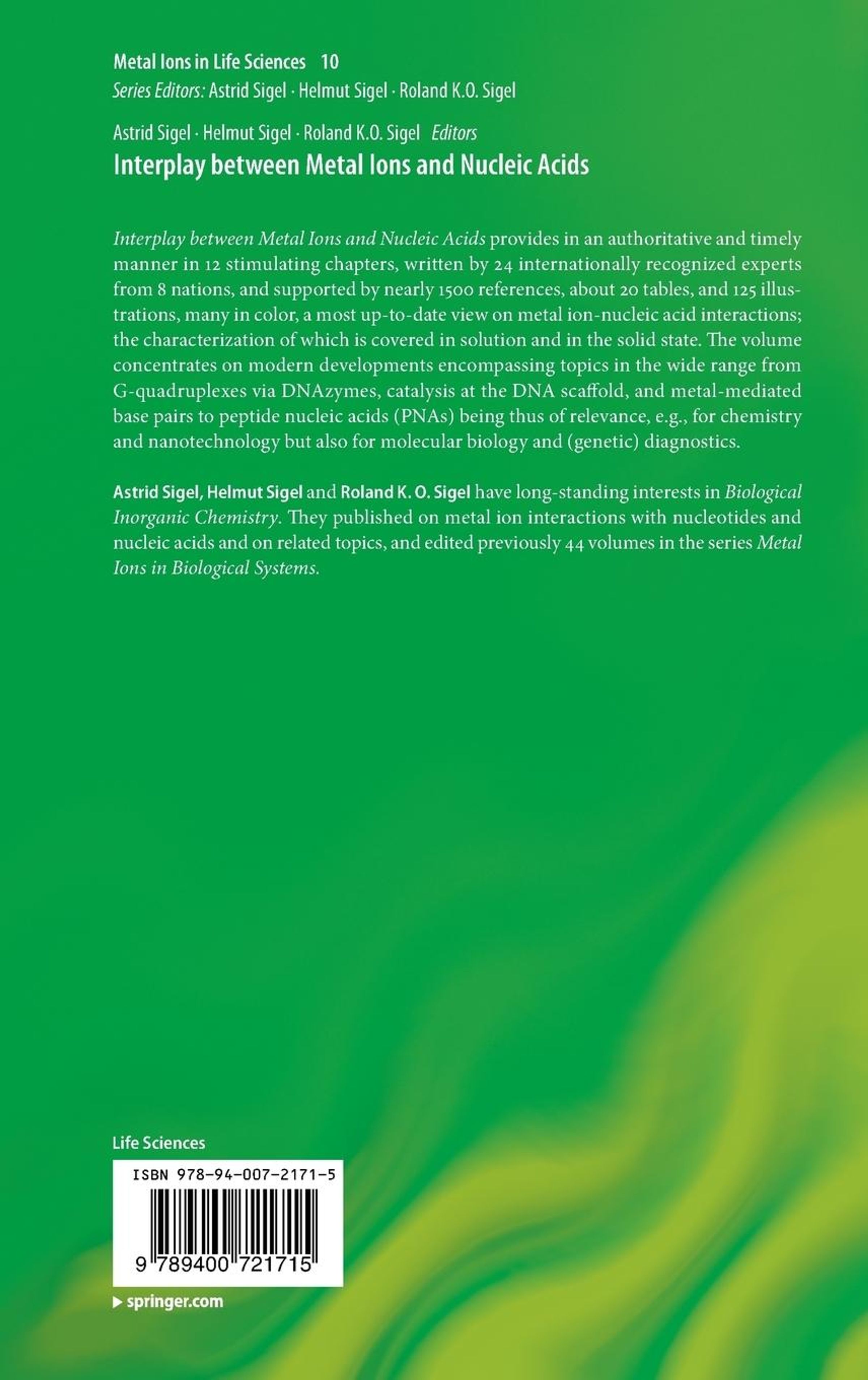 Interplay between Metal Ions and Nucleic Acids provides in an authoritative and timely manner in 12 stimulating chapters, written by 24 internationally recognized experts from 8 nations, and supported by nearly 1500 references, about 20 tables, and 125 illustrations, many in color, a most up-to-date view on metal ion-nucleic acid interactions; the characterization of which is covered in solution and in the solid state. The volume concentrates on modern developments encompassing topics in the wide range from G-quadruplexes via DNAzymes, catalysis at the DNA scaffold, and metal-mediated base pairs to peptide nucleic acids (PNAs) being thus of relevance, e. g., for chemistry and nanotechnology but also for molecular biology and (genetic) diagnostics.