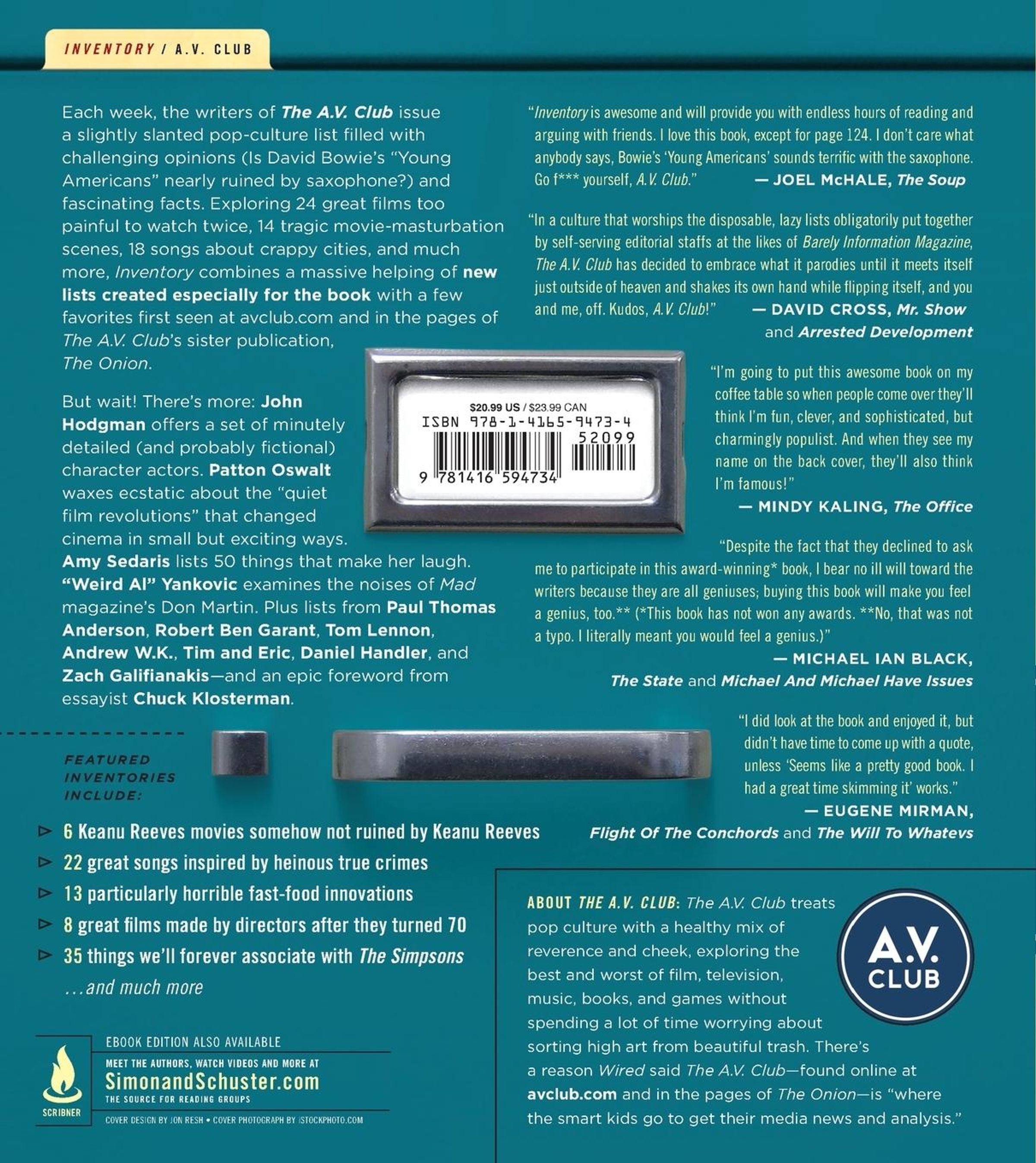 "24 Great Films Too Painful to Watch Twice" "14 Cover Songs That Are Better Than the Originals," "14 Tragic Movie Masturbation Scenes": If any of these titles intrigue you, you're ready for Inventory. Since its introduction in 2006, the weekly feature known as "Inventory." quirky, detailed lists compiled with knowledge and a large amount of humour has become one of the most popular elements of the print and web editions of A. V. Club, the arts and entertainment section of The Onion. Inventoryis filled with challenging opinions and fascinating facts.