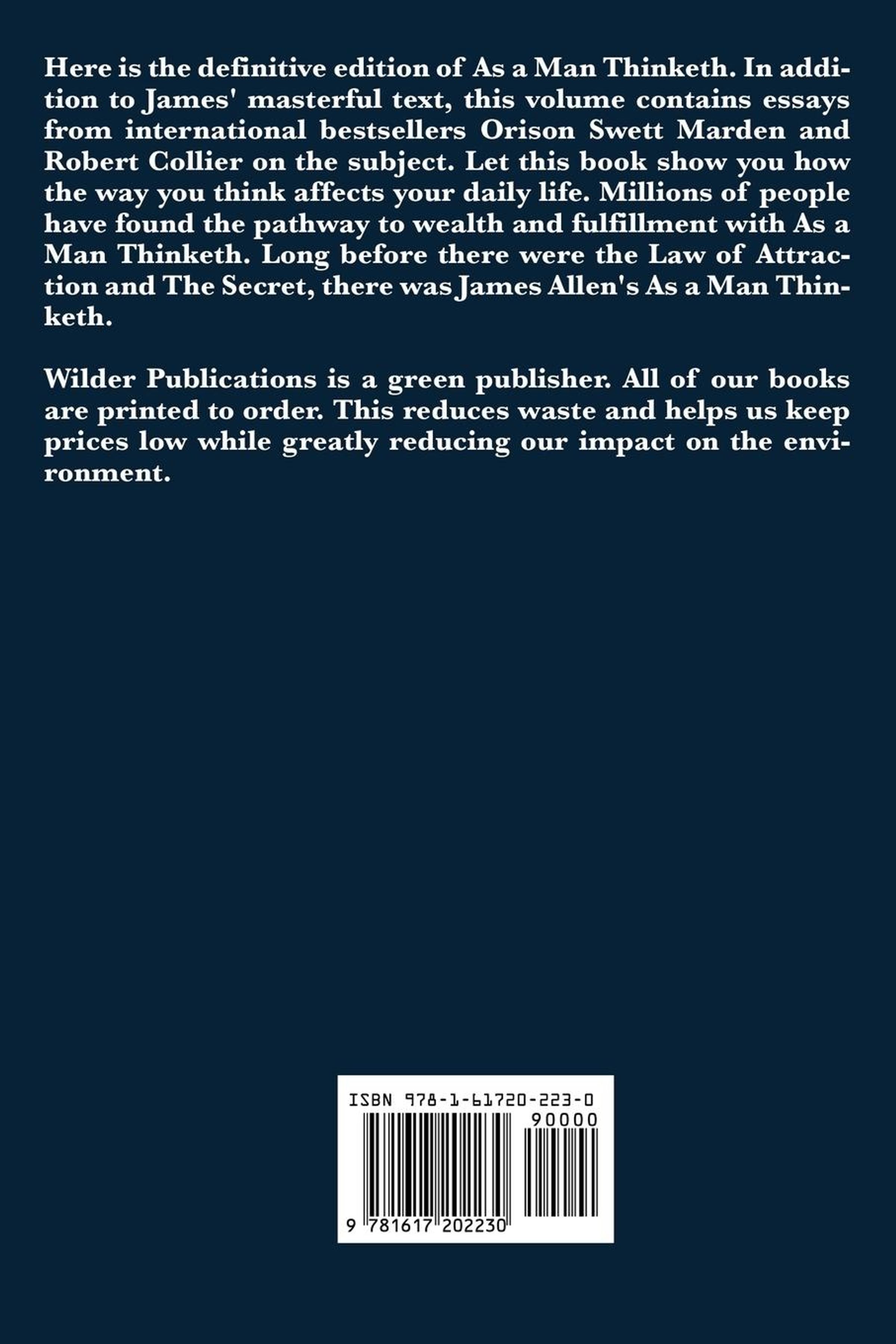 Here is the definitive edition of As a Man Thinketh. In addition to James' masterful text, this volume contains essays from international bestsellers Orison Swett Marden and Robert Collier on the subject. Let this book show you how the way you think affects your daily life. Millions of people have found the pathway to wealth and fulfillment with As a Man Thinketh. Long before there were the Law of Attraction and The Secret, there was James Allen's As a Man Thinketh.