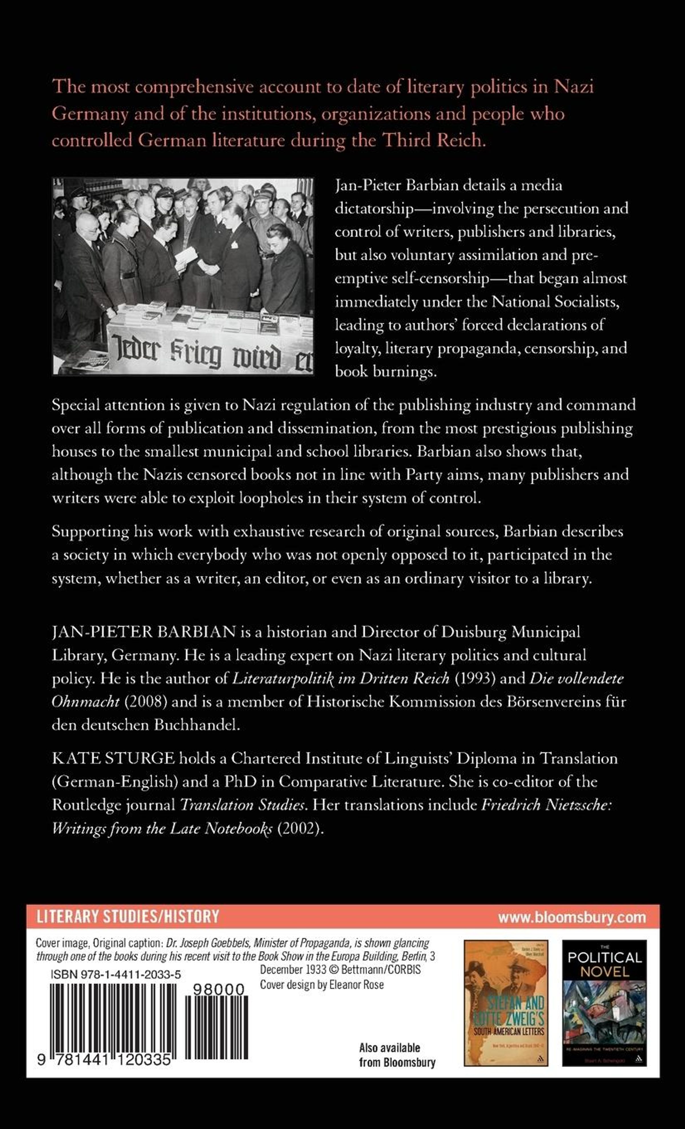 This is the most comprehensive account to date of literary politics in Nazi Germany and of the institutions, organizations and people who controlled German literature during the Third Reich. Barbian details a media dictatorship-involving the persecution and control of writers, publishers and libraries, but also voluntary assimilation and pre-emptive self-censorship-that began almost immediately under the National Socialists, leading to authors' forced declarations of loyalty, literary propaganda, censorship, and book burnings. Special attention is given to Nazi regulation of the publishing industry and command over all forms of publication and dissemination, from the most presitigious publishing houses to the smallest municipal and school libraries. Barbian also shows that, although the Nazis censored books not in line with Party aims, many publishers and writers took advantage of loopholes in their system of control. Supporting his work with exhaustive research of original sources, Barbian describes a society in which everybody who was not openly opposed to it, participated in the system, whether as a writer, an editor, or even as an ordinary visitor to a library.