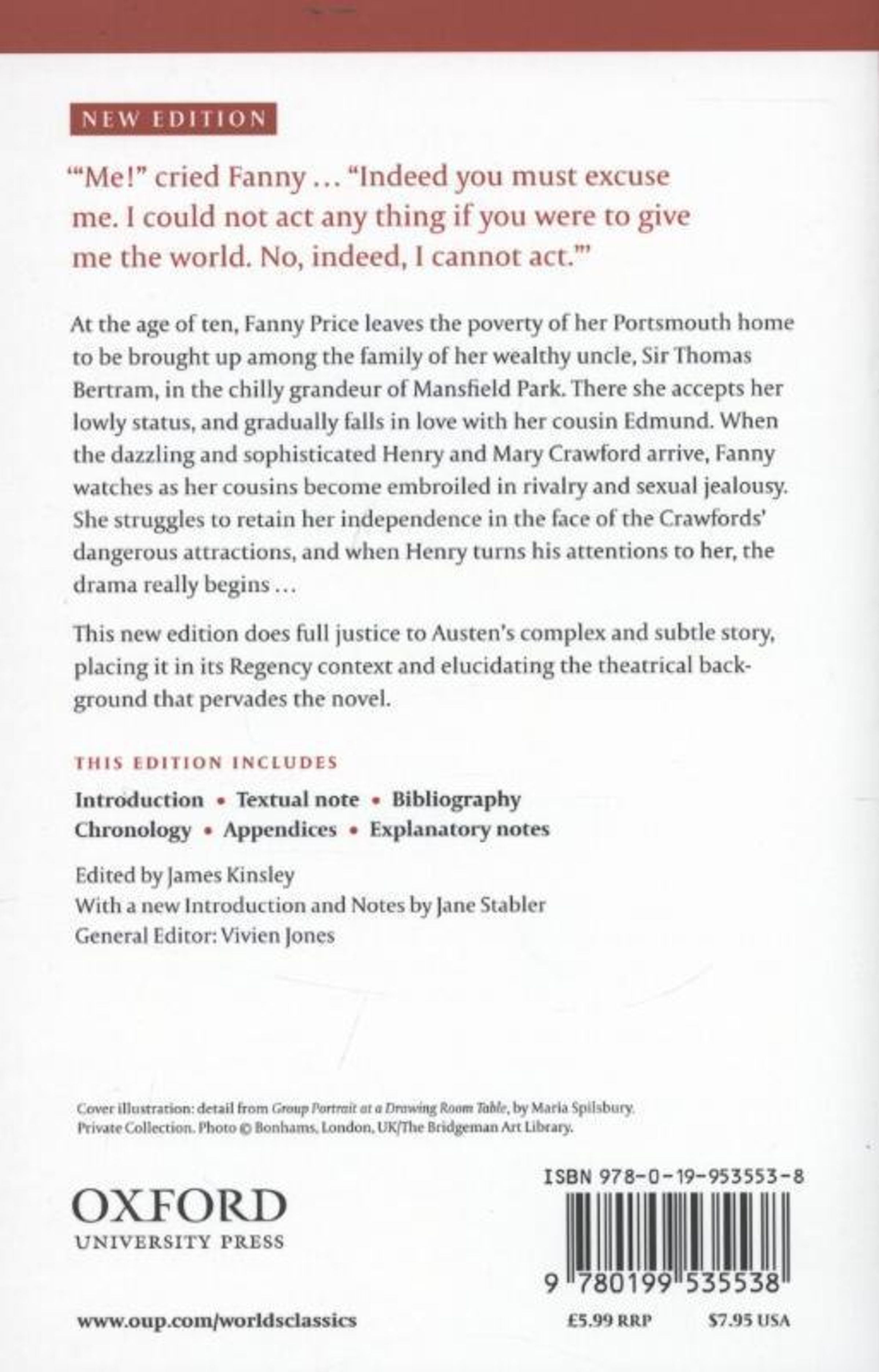 At the age of ten, Fanny Price leaves the poverty of her Portsmouth home to be brought up among the family of her wealthy uncle, Sir Thomas Bertram, in the chilly grandeur of Mansfield Park. She gradually falls in love with her cousin Edmund, but when the dazzling and sophisticated Crawfords arrive, and amateur theatricals unleash rivalry and sexual jealousy, Fanny has to fight to retain her independence. This new edition places Mansfield Park in its Regency context and elucidates the theatrical background that pervades the novel.